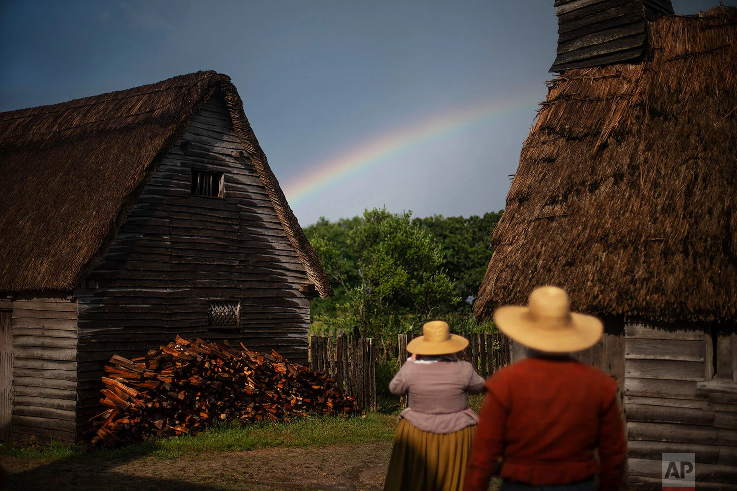 Museum educators playing the role of Pilgrims look at a rainbow over Plimoth Plantation, a living history museum village, Wednesday, Aug. 12, 2020, in Plymouth, Mass. (AP Photo/David Goldman)