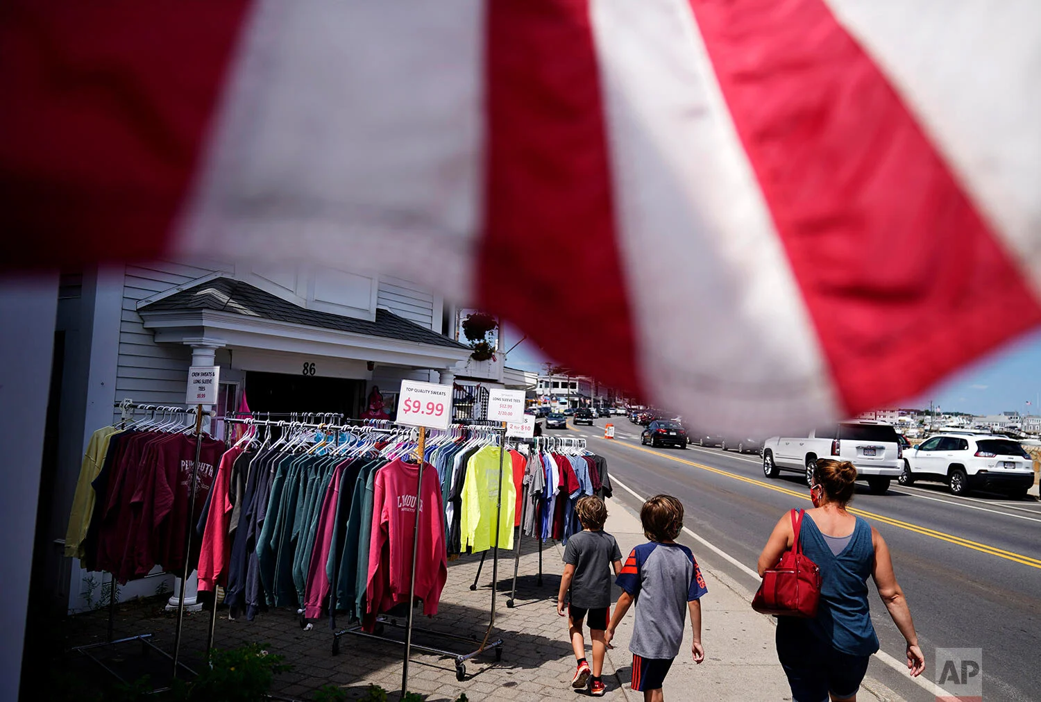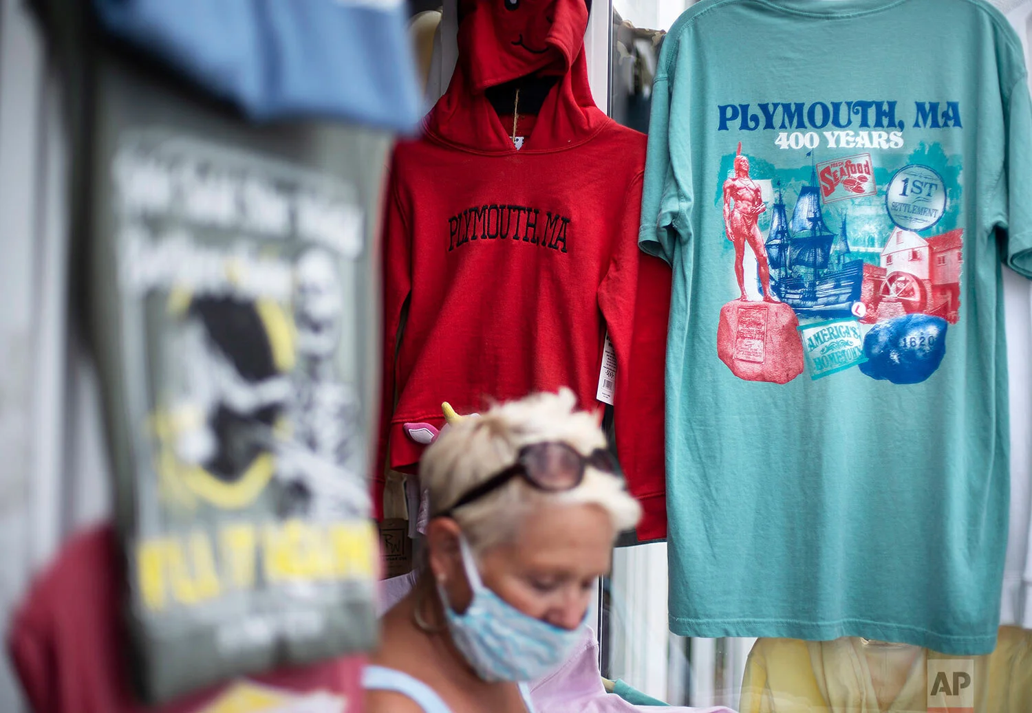 Pedestrians pass a gift shop in Plymouth, Mass., the traditional point of arrival of the Pilgrims in 1620 on the Mayflower, Wednesday, Aug. 12, 2020. (AP Photo/David Goldman)