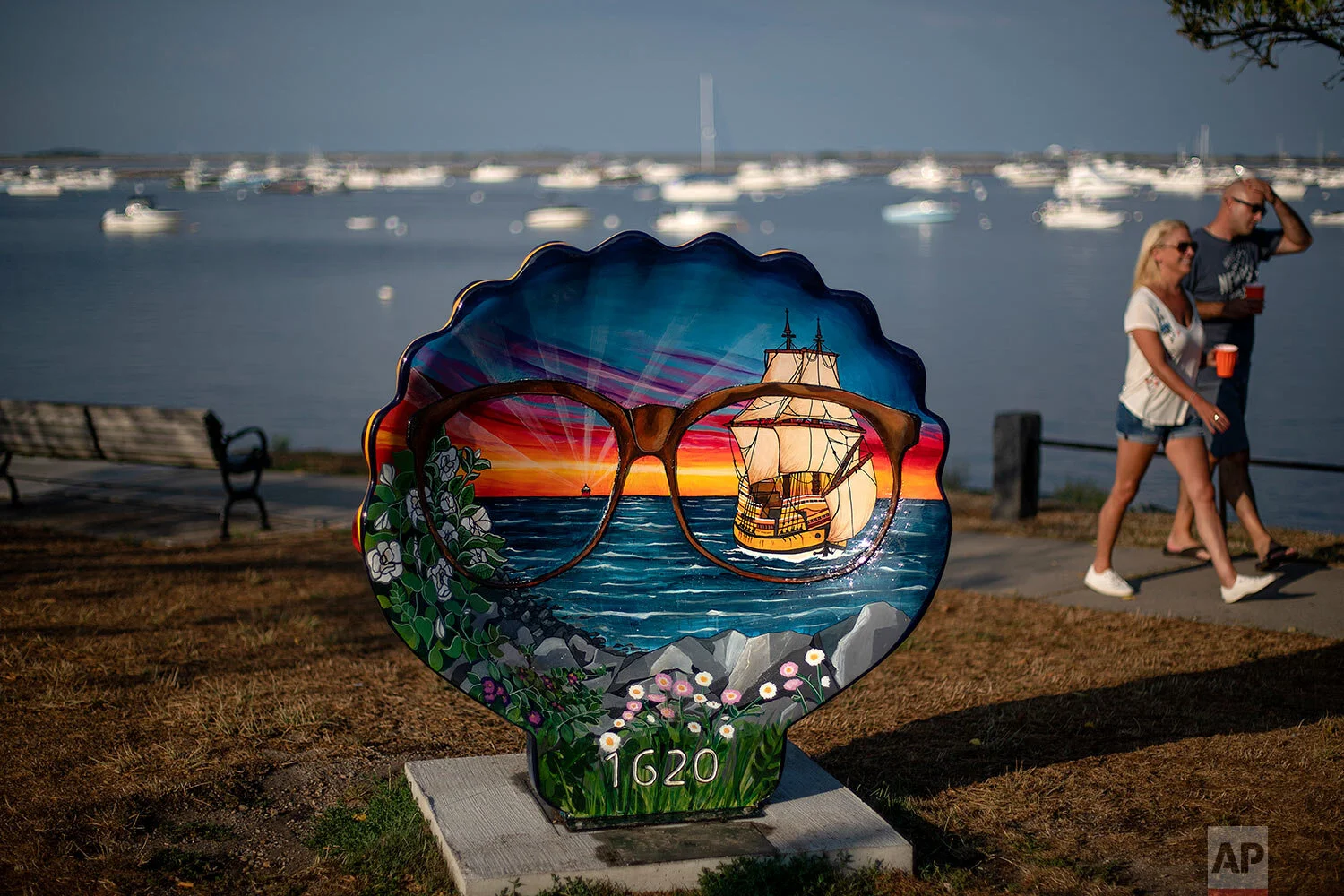 Pedestrians pass a commemorative shell decorated to celebrate the 400th anniversary of the arrival of the Pilgrims in 1620 on the Mayflower, in Plymouth, Mass., Wednesday, Aug. 12, 2020. (AP Photo/David Goldman)