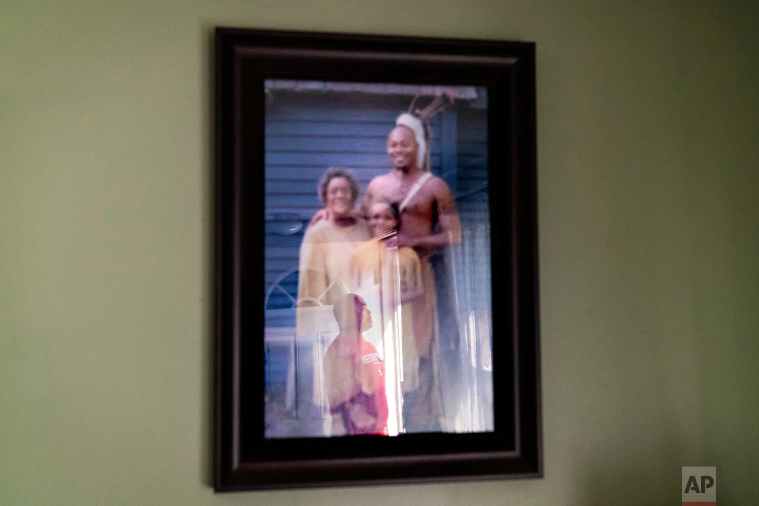 Troy Currence is reflected in a photo of himself with his mother, Hazel Harding Currence, left, and his daughter, Kendall Currence, three generations of Herring Pond Wampanoag tribal members, at his home in Bourne, Mass., Monday, Sept. 21, 2020. (AP Photo/David Goldman)