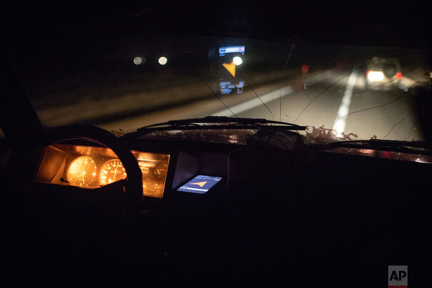 A car follows a coordinate leading to a remote desert in which smugglers build fishing boats intended to be used for migration to the Canary Islands from Dakhla, Morocco-administered Western Sahara, Dec. 22, 2020. (AP Photo/Mosa'ab Elshamy)