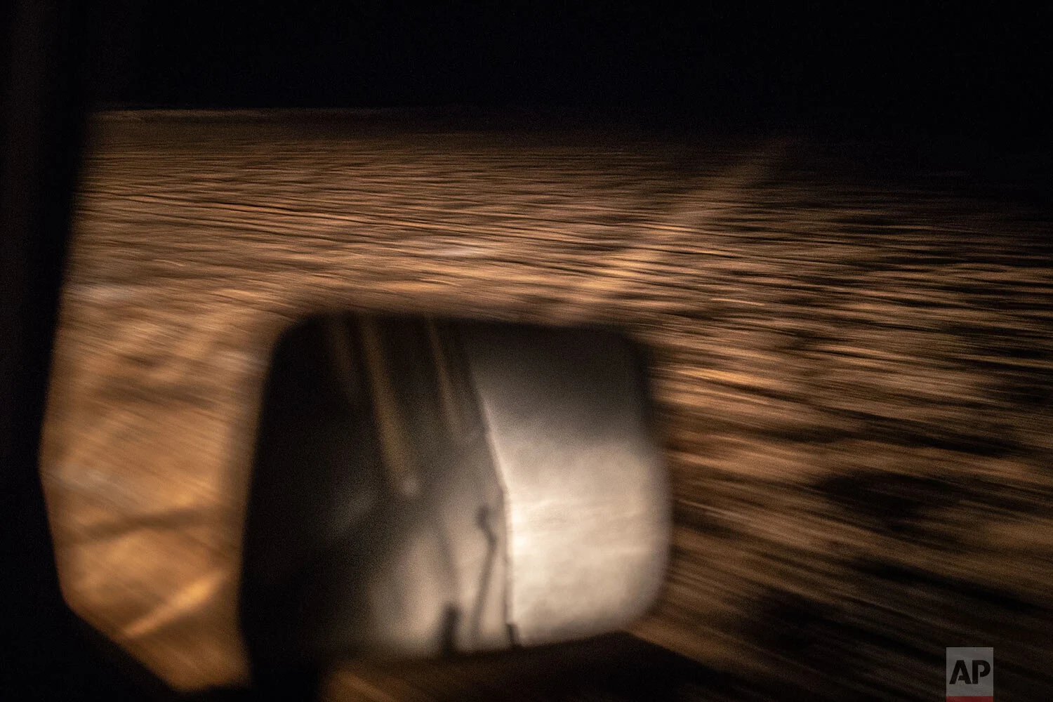 A car follows a coordinate leading to a remote desert in which smugglers build fishing boat intended to be used for migration to the Canary Islands, in a remote desert out of the town of Dakhla, Morocco-administered Western Sahara, Dec. 22, 2020. (AP Photo/Mosa'ab Elshamy)