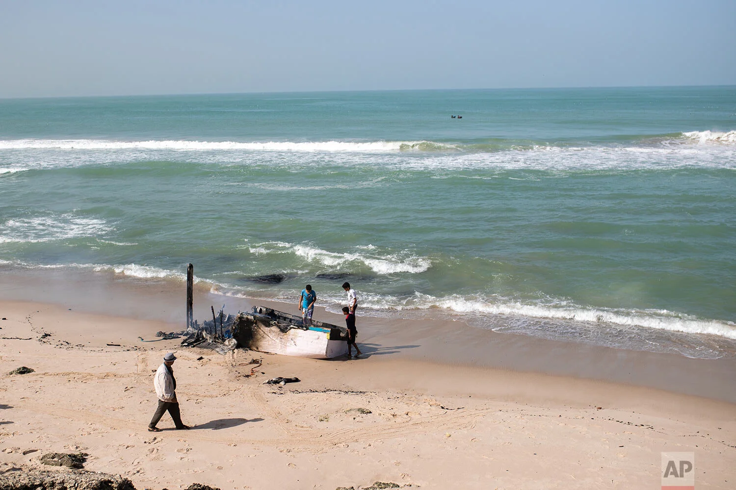 Children play on a fishing boat intended to be used for migration but was burnt by authorities, near the fishing boat of La Sarga, in Dakhla, Morocco-administered Western Sahara, Dec. 22, 2020. (AP Photo/Mosa'ab Elshamy)