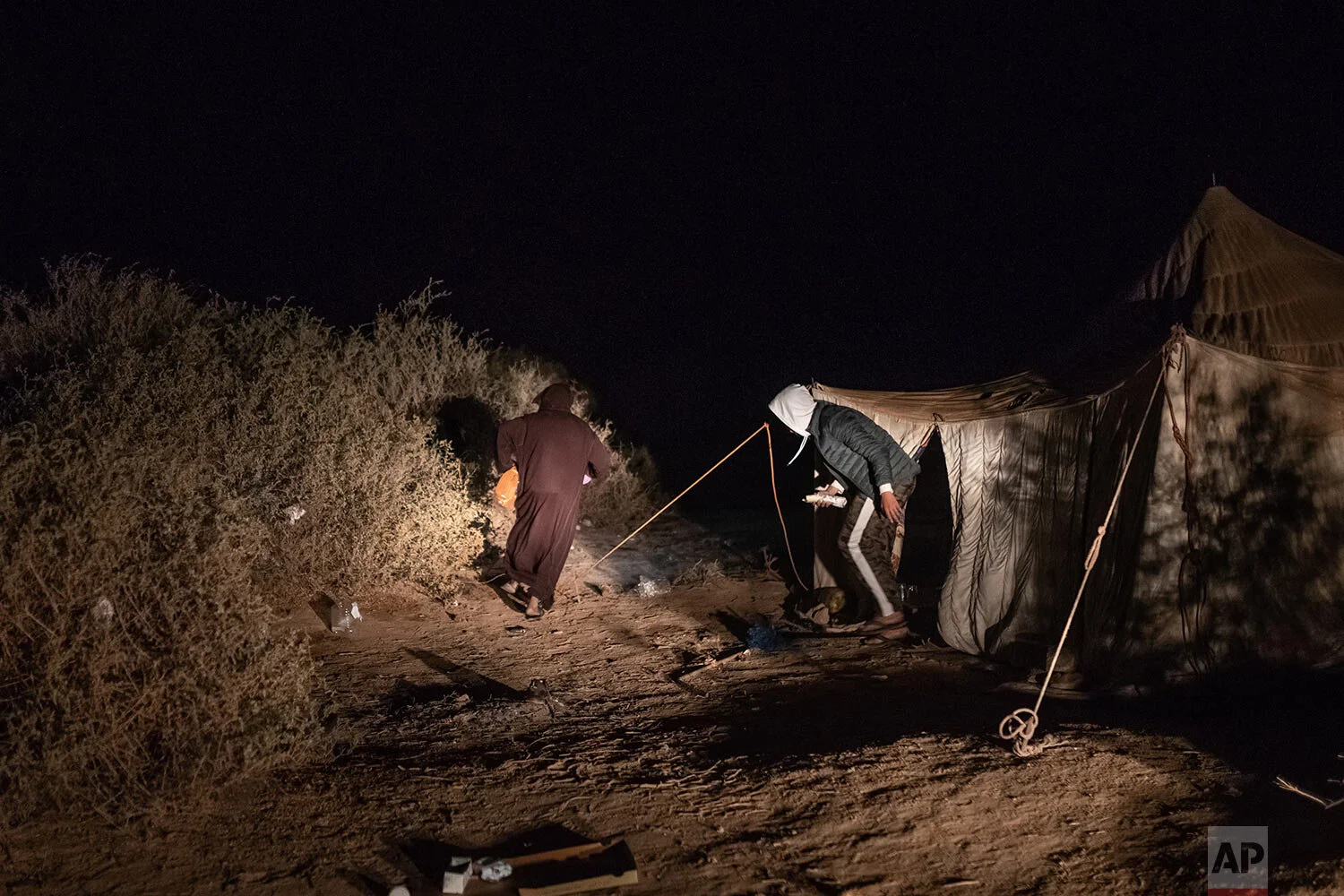Smugglers walk past a tent used while building fishing boats intended to be used for migration to the Canary Islands, in a remote desert out of the town of Dakhla, Morocco-administered Western Sahara, Dec. 22, 2020. (AP Photo/Mosa'ab Elshamy)