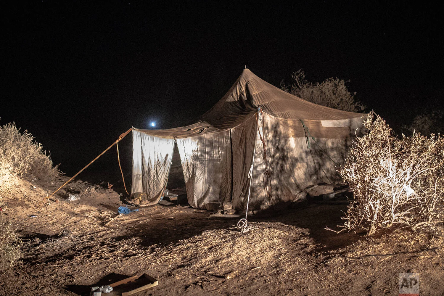 A tent is set up in a remote desert where smugglers stay while building fishing boats intended to be used for migration to the Canary Islands, in a remote desert out of the town of Dakhla, Morocco-administered Western Sahara, Dec. 22, 2020. (AP Photo/Mosa'ab Elshamy)