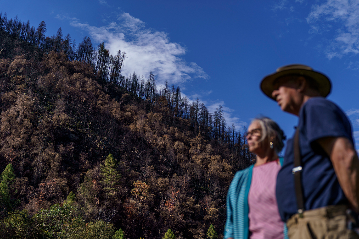 A scorched hillside rises from the backyard of Ruth, 72, and John Bain, 76, a member of the Karuk tribe, where last year's Slater Fire destroyed a house and several antique cars on their property in Happy Camp, Calif., Wednesday, Oct. 6, 2021. "They can get rid of the brush and that will save a bigger fire down the road, probably," said John. "It's gonna help because that's all going to come back in two or three years as just brush and if they can keep that under control, it could stop a big fire. I think the tribe should do it and the Forest Service should do it too." (AP Photo/David Goldman)