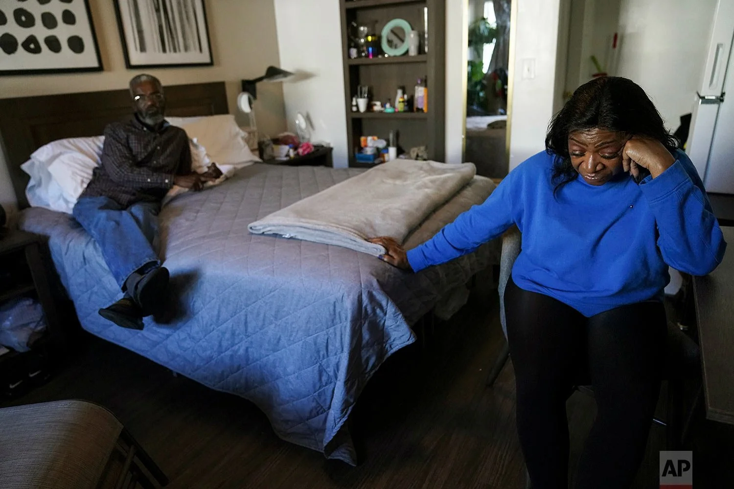 Faye Moore, right, and her partner Garry Betared, left, talk about being evicted from their home as they sit in a hotel room on Wednesday, Nov. 24, 2021, in Morrow, Ga. (AP Photo/Brynn Anderson)
