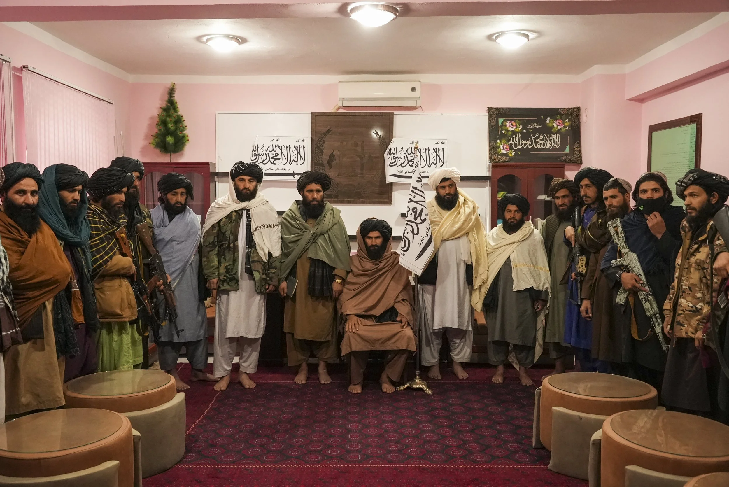 Badghis Deputy Governor Molwi Mohibullah Asad (in the middle) and other members of Taliban line up for the interview in the governors office in Qala-e-Naw Afghanistan, Saturday, Dec. 13, 2021. (AP Photo/Mstyslav Chernov)