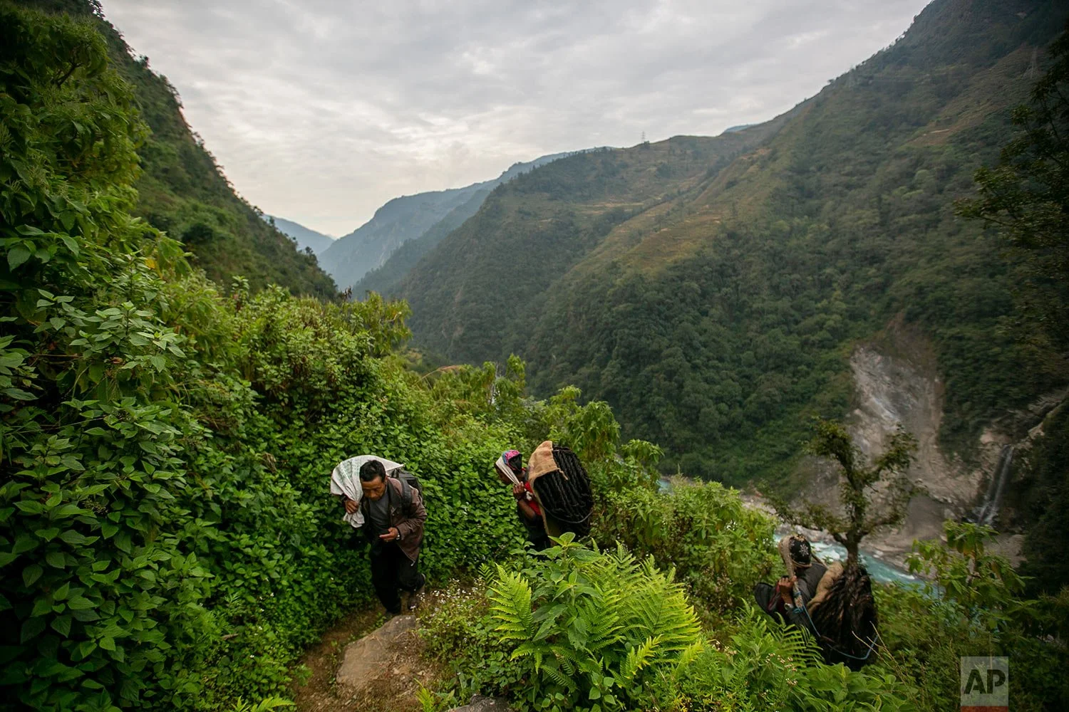 Honey hunters climb a hill carrying rope and other tools required for harvesting cliff honey in Dolakha, 115 miles east of Kathmandu, Nepal, Nov. 19, 2021. (AP Photo/Niranjan Shrestha)