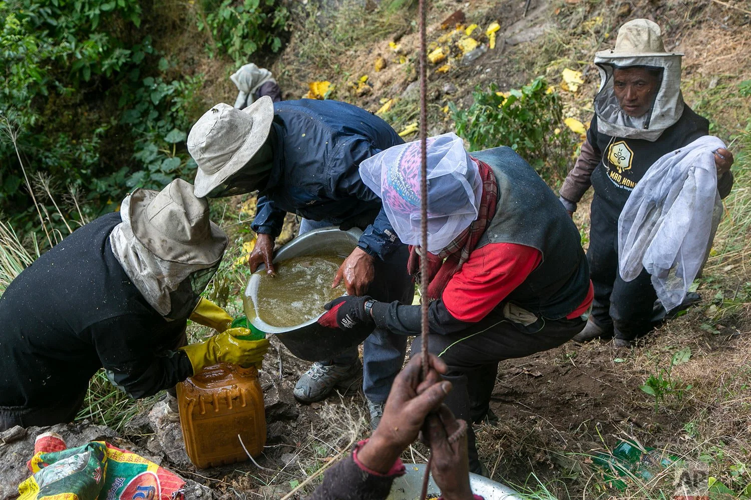 Nepalese honey hunters pour cliff honey into a container after harvesting in Dolakha, 115 miles east of Kathmandu, Nepal, Nov. 19, 2021. (AP Photo/Niranjan Shrestha)