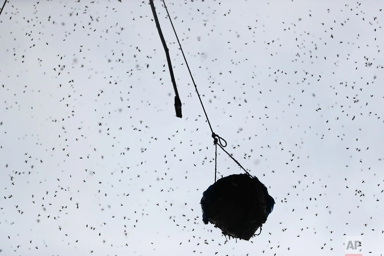 Bees hovering around a basket containing cliff honey being harvested in Dolakha, 115 miles east of Kathmandu, Nepal, Nov. 19, 2021. (AP Photo/Niranjan Shrestha)