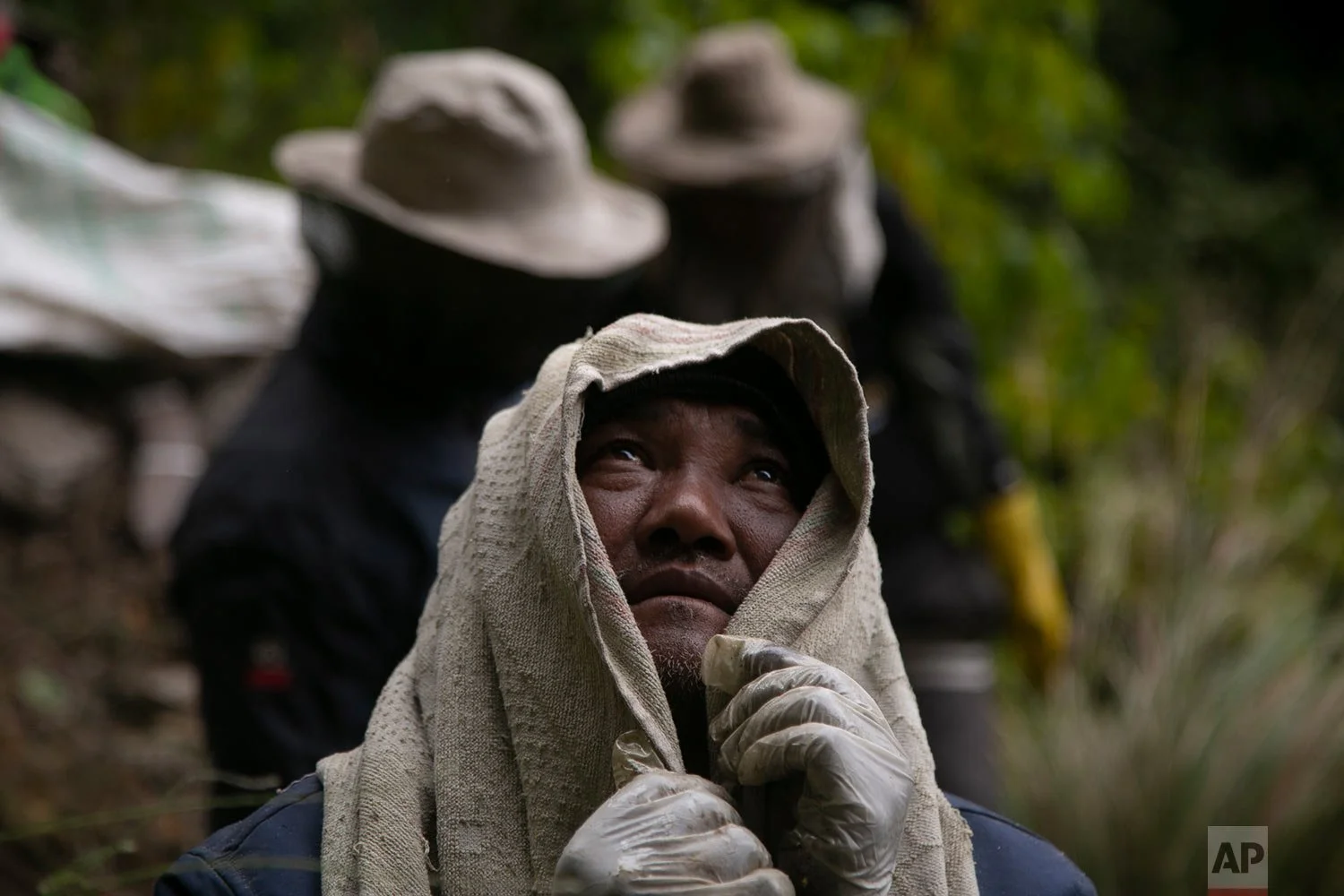 Thousands of bees hovered over the men's faces, which were protected by face nets.