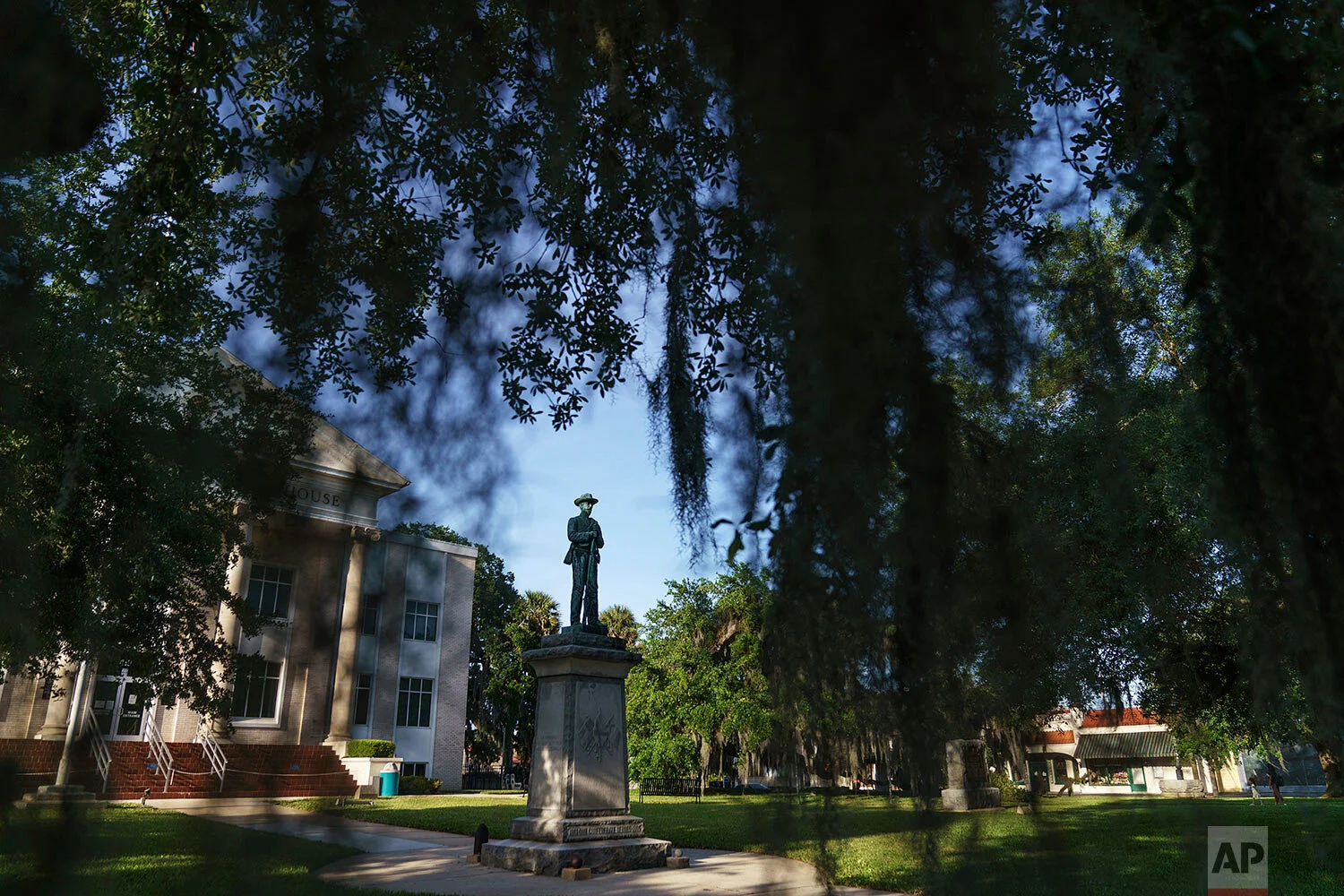 A Confederate statue stands outside the Putnam County Courthouse in Palatka, Fla., Tuesday, April 13, 2021. (AP Photo/David Goldman)