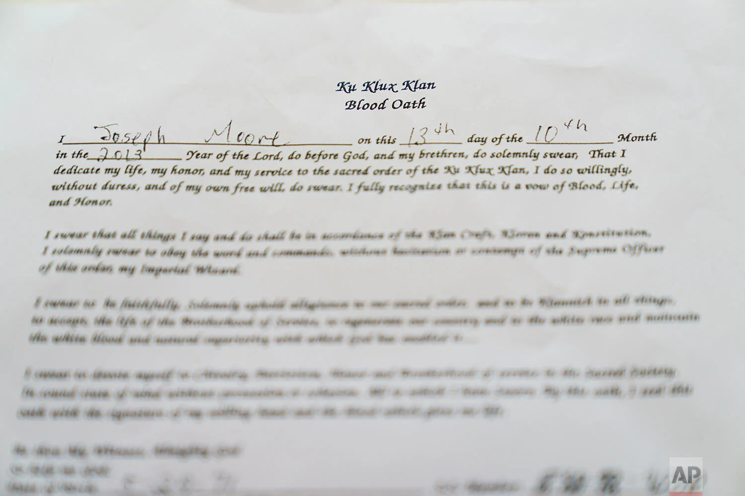 He also signed a “blood oath,” part of which read, “I swear ... to be Klannish in all things, to accept the life of the Brotherhood of Service, to regenerate our country and to the white race and maintain the white blood and natural superiority with which God has enabled it.”