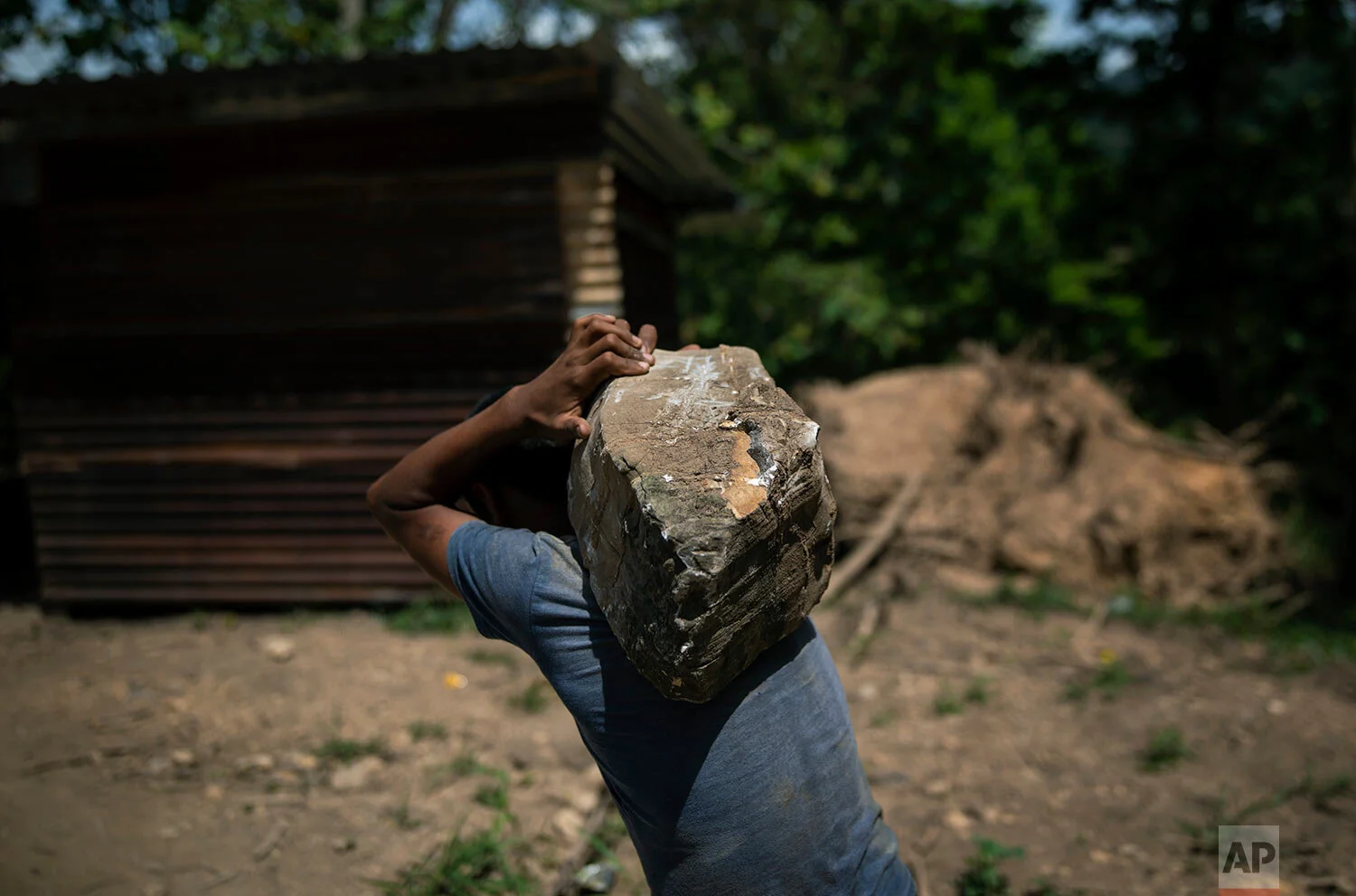 Ivan Varela carries a cinder block as he helps day laborers lay brick for a new home for his parents, who were left homeless in November 2020 when their house was obliterated by a mudslide triggered by Hurricanes Eta and Iota, at the construction site in Mission San Francisco de Asis, Honduras, Thursday, July 15, 2021. (AP Photo/Rodrigo Abd)
