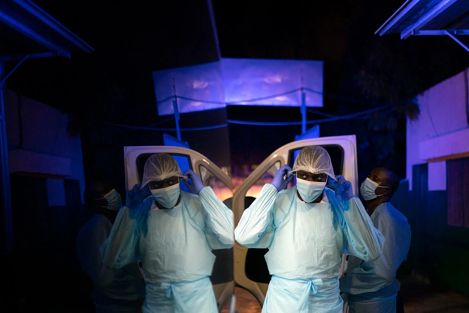 Yahya Niane grabs two small oxygen cylinders and heads to the ambulance with his team. Upon arrival, they find the young woman's worried father waving an envelope in front of her mouth, a desperate effort to send more air her way.