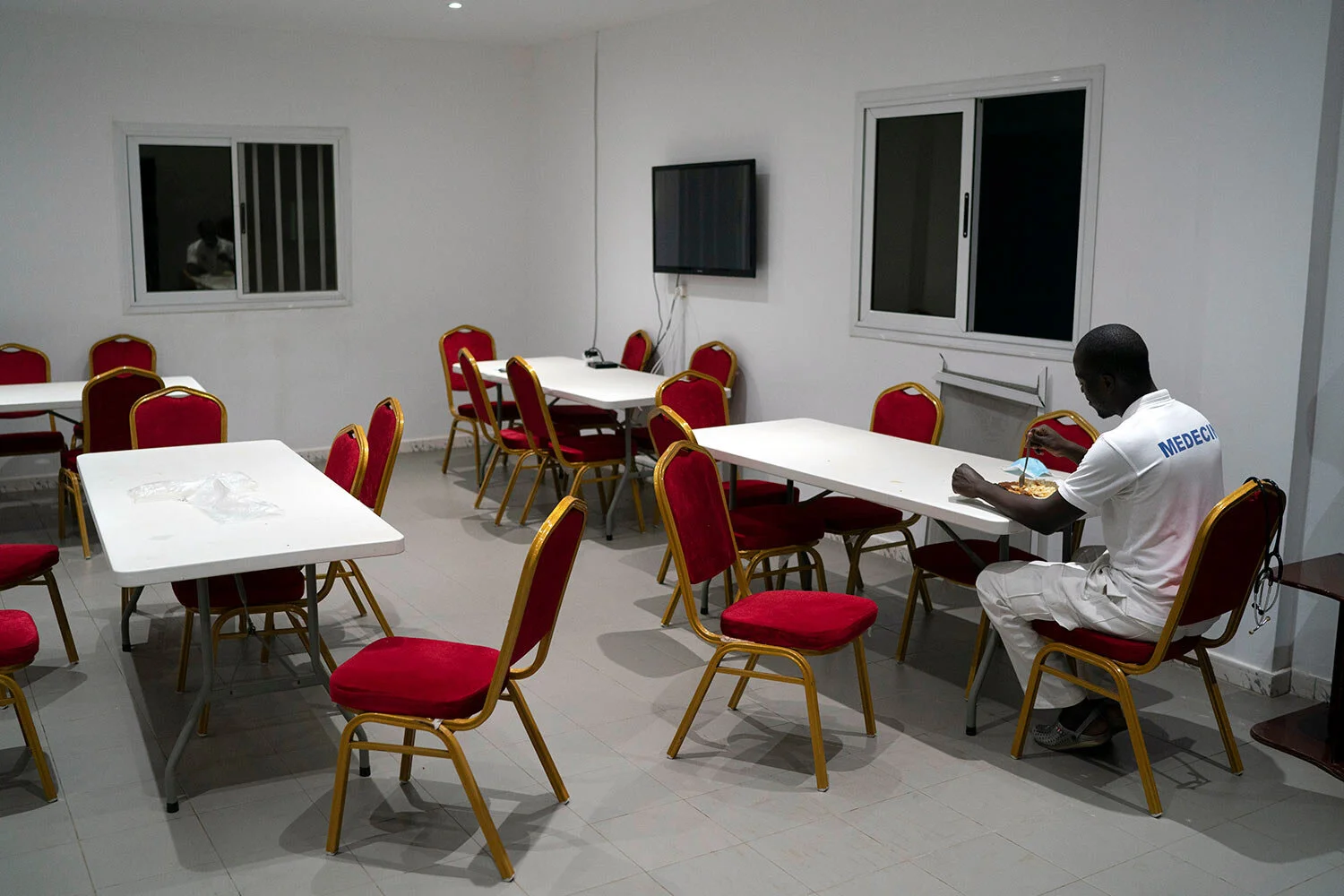 Mobile Emergency Care Service (SAMU) doctor Yahya Niane, takes a break at the canteen in the SAMU headquarters in Dakar, Senegal, Friday, Aug. 6, 2021. (AP Photo/Leo Correa)