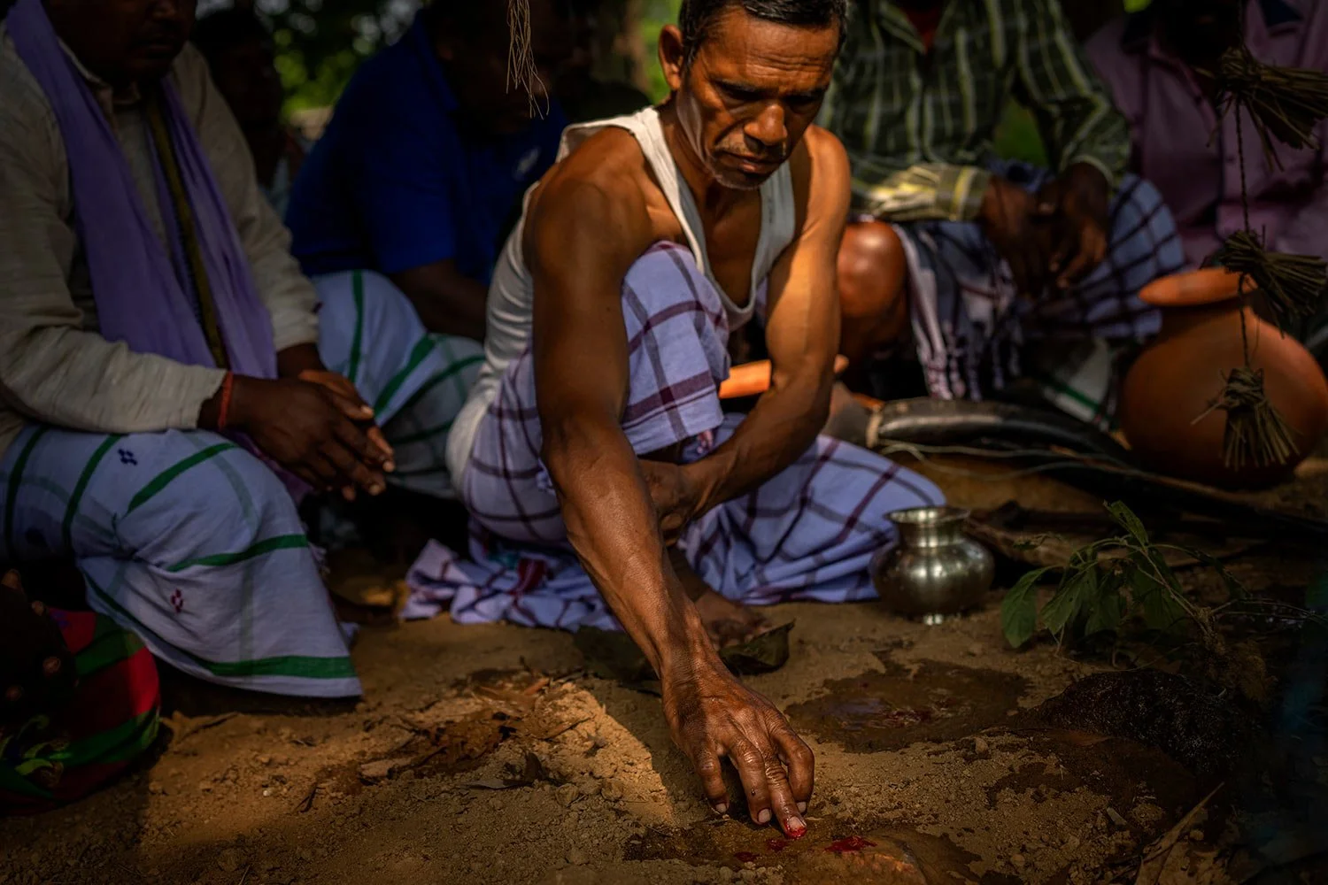 On that day inside the grove, worshippers displayed their reverence for the natural world, making circles around a Sal plant and three sacred stones, one each for the malevolent spirits they believe need pleased. They knelt as Maranda smeared the stones with vermillion paste, bowed to the sacred plant and laid down fresh leaves covered in a cow dung paste.