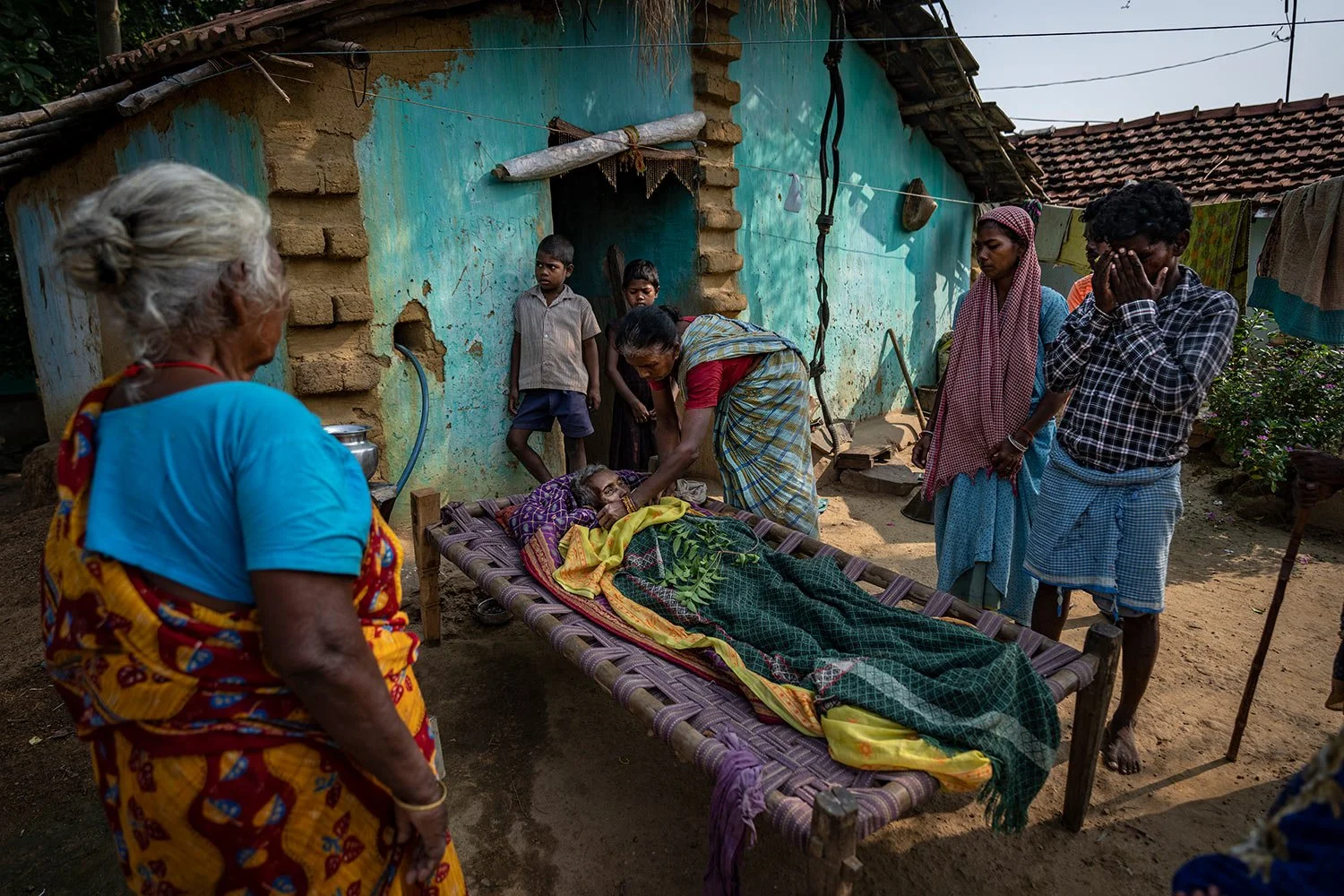 Family members stand next to the body of an elderly tribes woman after she passed away in Donkasai village in the eastern Indian state of Jharkhand, Oct. 20, 2022. (AP Photo/Altaf Qadri)