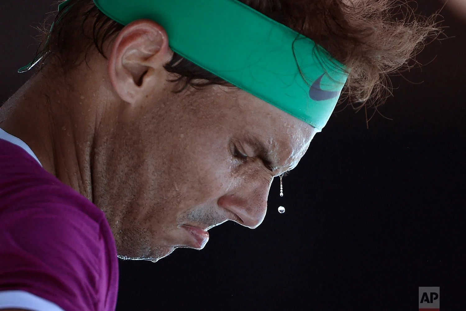 Sweat drops from the face of Rafael Nadal, of Spain, during a break in his second round match against Yannick Hanfmann, of Germany, at the Australian Open tennis championships in Melbourne, Australia, Wednesday, Jan. 19, 2022. (AP Photo/Andy Brownbill)