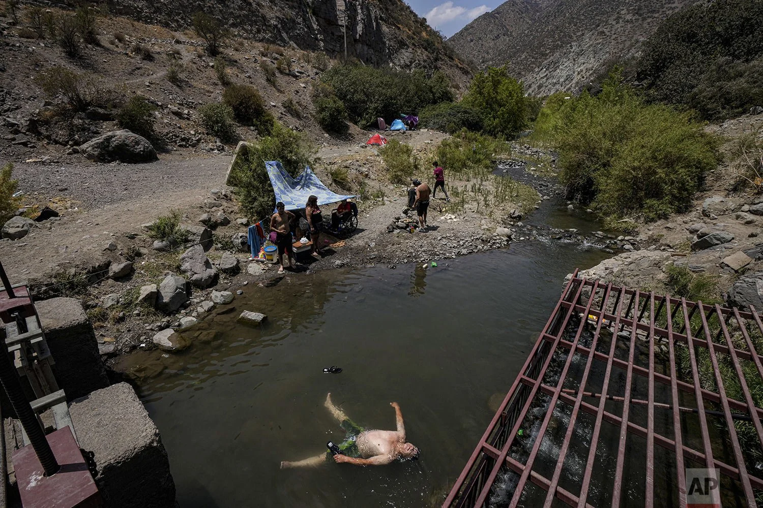 A man floats on the Colina river that has drastically decreased its flow due to an ongoing drought that has lasted for more than a decade, near Marco Peralta's bee farm on the outskirts of Santiago, Chile, Jan. 30, 2022. (AP Photo/Esteban Felix)