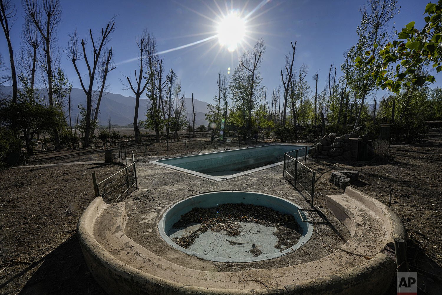 An abandoned swimming pool is seen at a vacation center near the Aculeo lagoon, in Paine, Chile, Jan. 25, 2022. (AP Photo/Esteban Felix)
