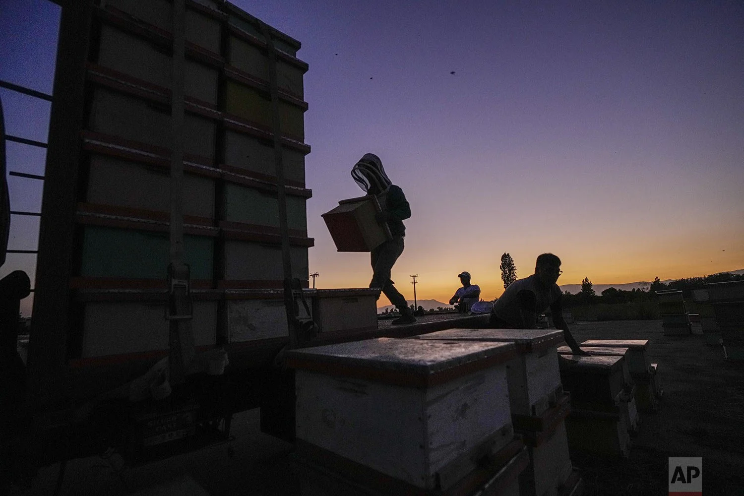 Brandon, the son of beekeeper Carlos Peralta, loads beehives on a truck to be taken south due to the drought that affects the central zone of Chile, in Colina on the outskirts of Santiago, Jan. 31, 2022. (AP Photo/Esteban Felix)