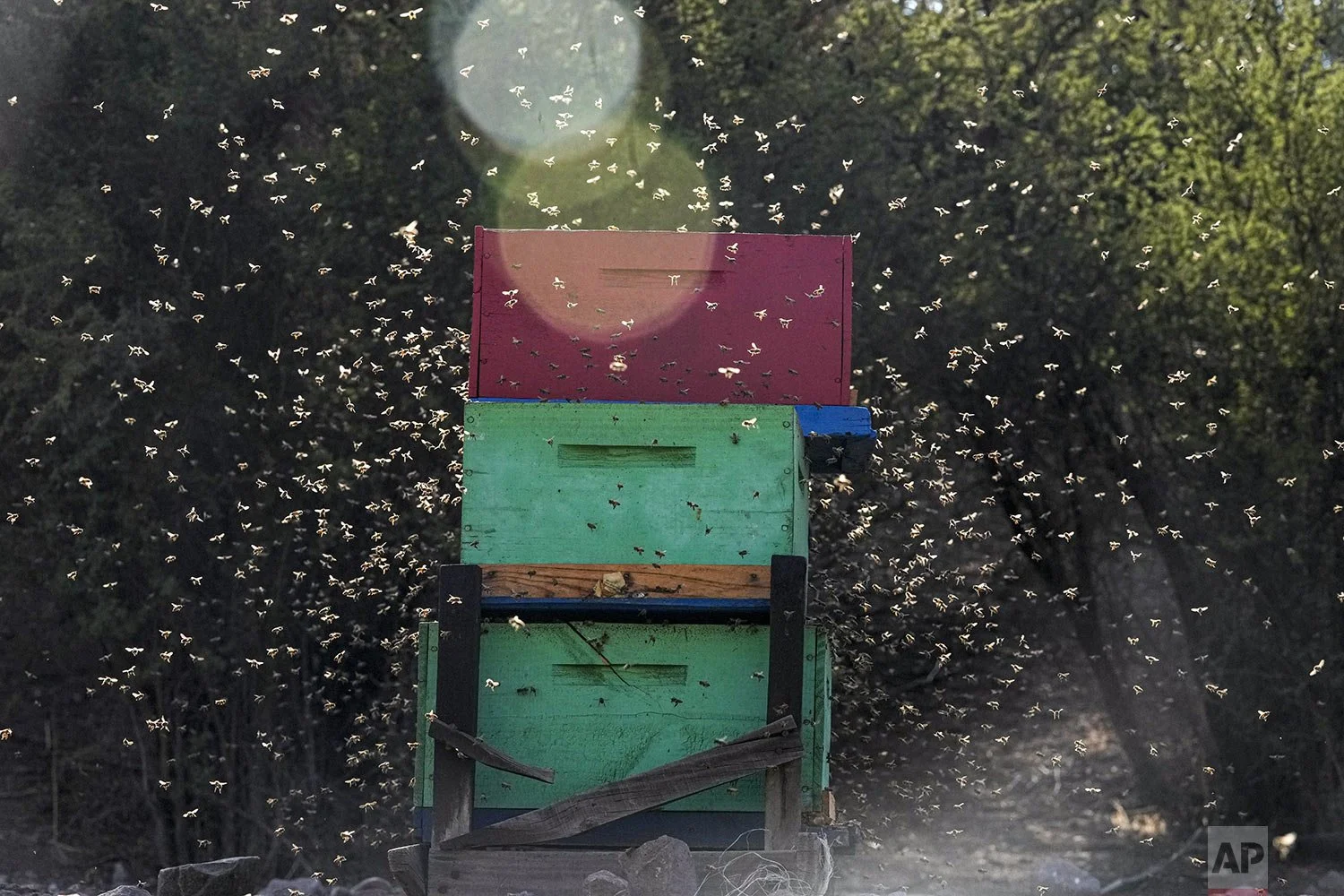 Bees pillage another colony at beekeeper Marco Peralta's farm in Colina on the outskirts of Santiago, Chile, Jan. 30, 2022. (AP Photo/Esteban Felix)
