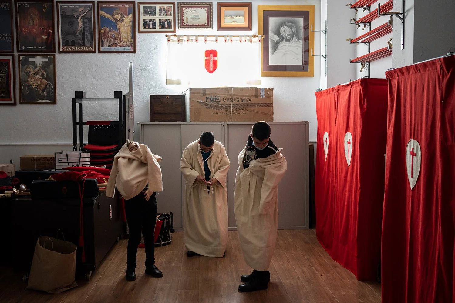 Penitents from 'Real Cofradia del Santisimo Cristo de las Injurias' also known as 'El Silencio' brotherhood get dressed prior a procession in Zamora, Spain, Wednesday, April 13, 2022. (AP Photo/Bernat Armangue)