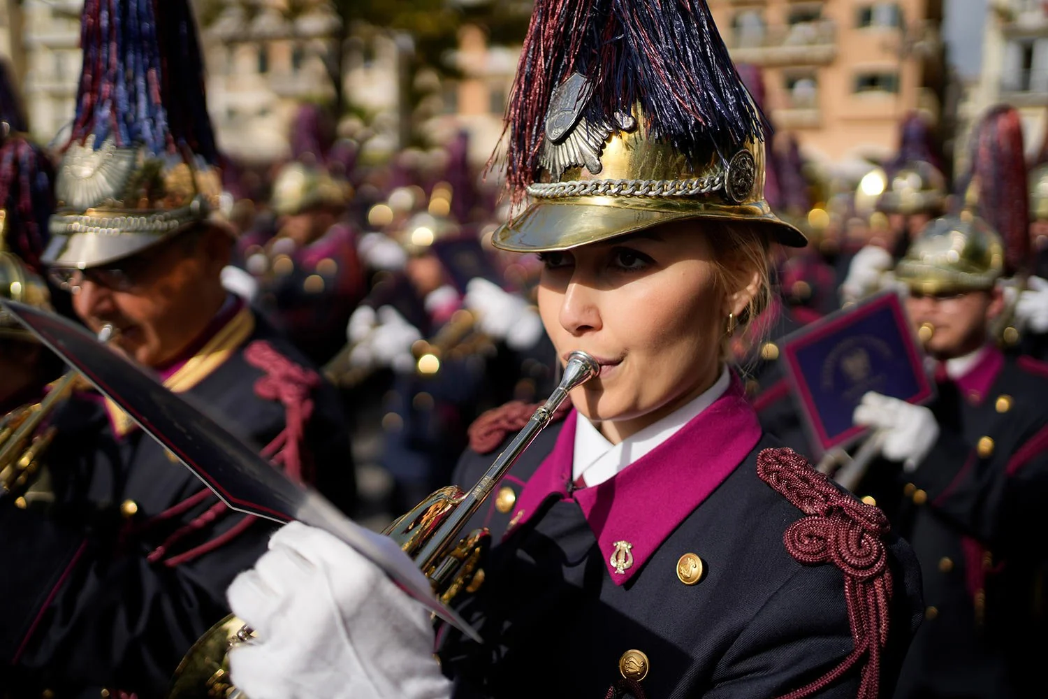 A member of a philharmonic band performs during the procession of Jesus' funeral bier, called “the Epitaph” in Greek, during Easter celebrations on the Ionian Sea island of Corfu, northwestern Greece, on Saturday, April 23, 2022. (AP Photo/Thanassis Stavrakis)