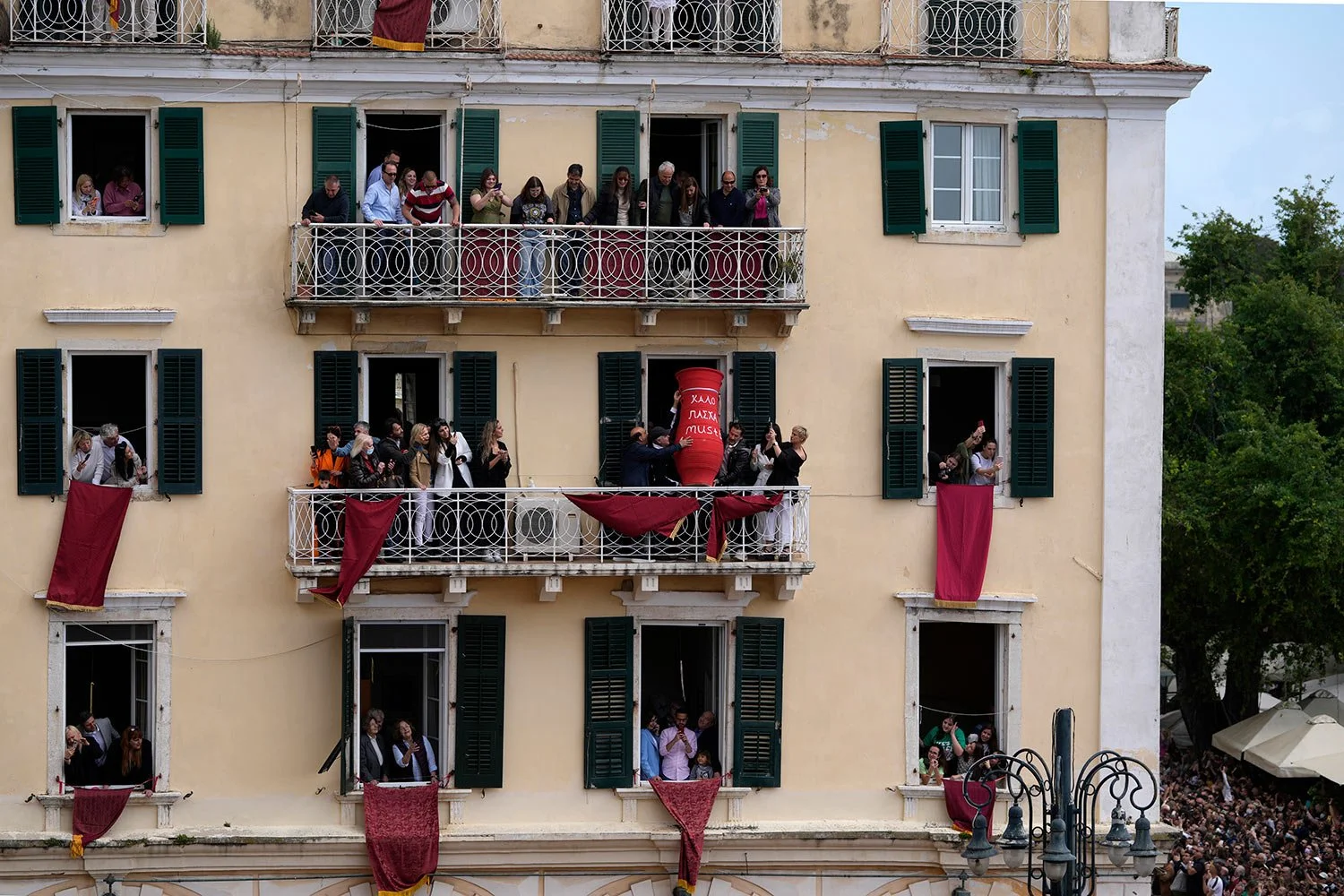 Crowds lined the old city of Corfu’s narrow streets Saturday morning for one of the most spectacular events, called ‘botides,’ that involves dropping clay jars full of water from balconies to crash with a loud bang on the streets below, spraying attendees with water. Locals consider it a miracle that there have been no serious injuries from flying clay shards. This ancient event’s original purpose was to ward off evil spirits.