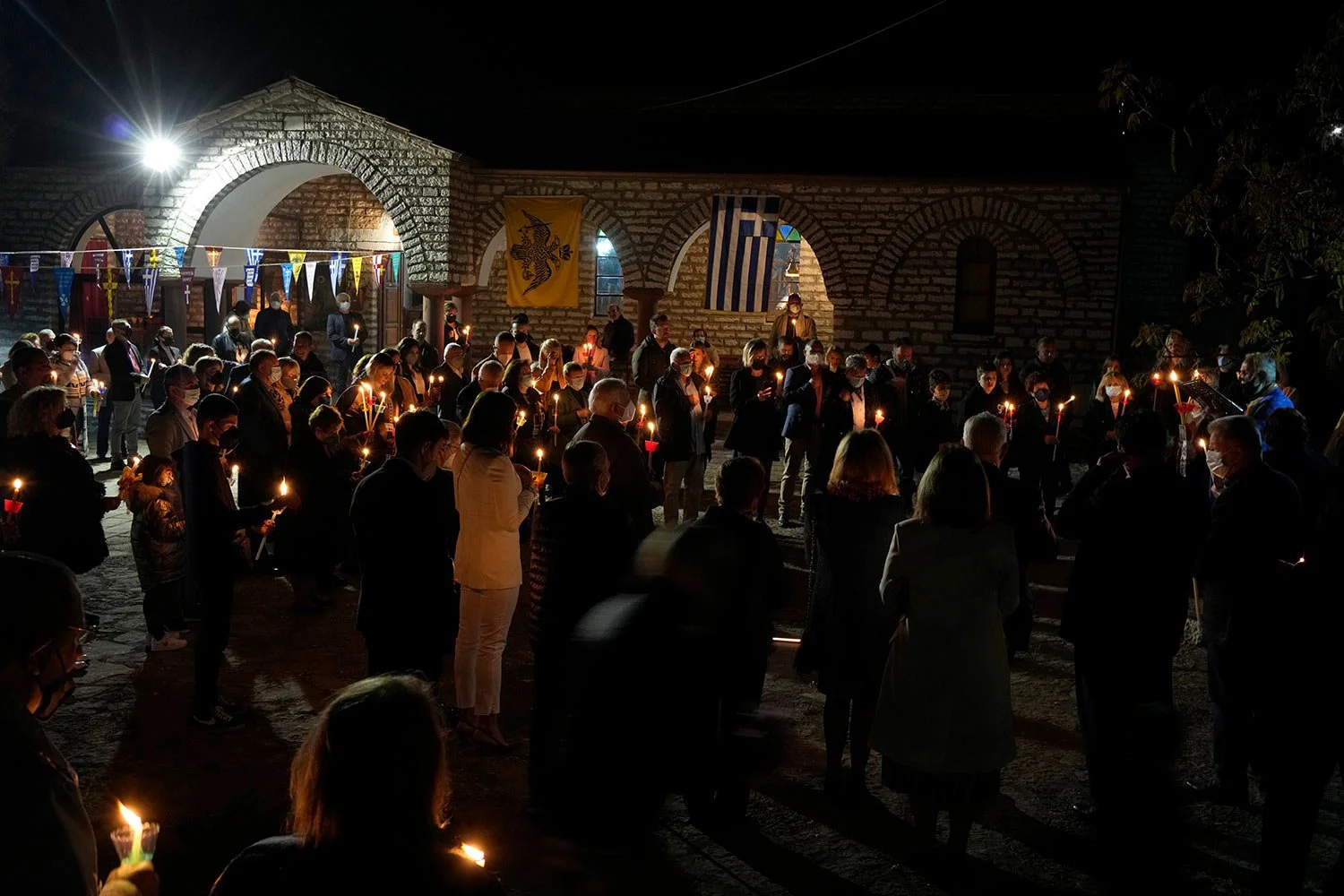 Faithful attend the Resurrection liturgy outside Agios Georgios church during celebrations for the Orthodox Easter in Myrodafni village, Epirus region, northwestern Greece, on Sunday, April 24, 2022. (AP Photo/Thanassis Stavrakis)