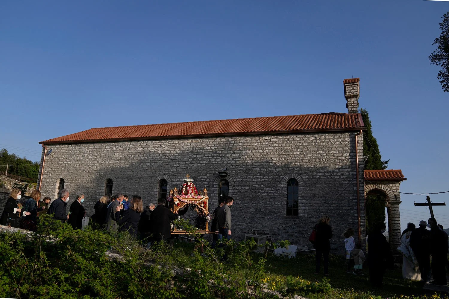 Faithful follow the procession of Jesus' funeral bier, called “the Epitaph” in Greek, in Agios Georgios church in Myrodafni village, Epirus region, northwestern Greece, on Good Friday, April 22, 2022. (AP Photo/Thanassis Stavrakis)