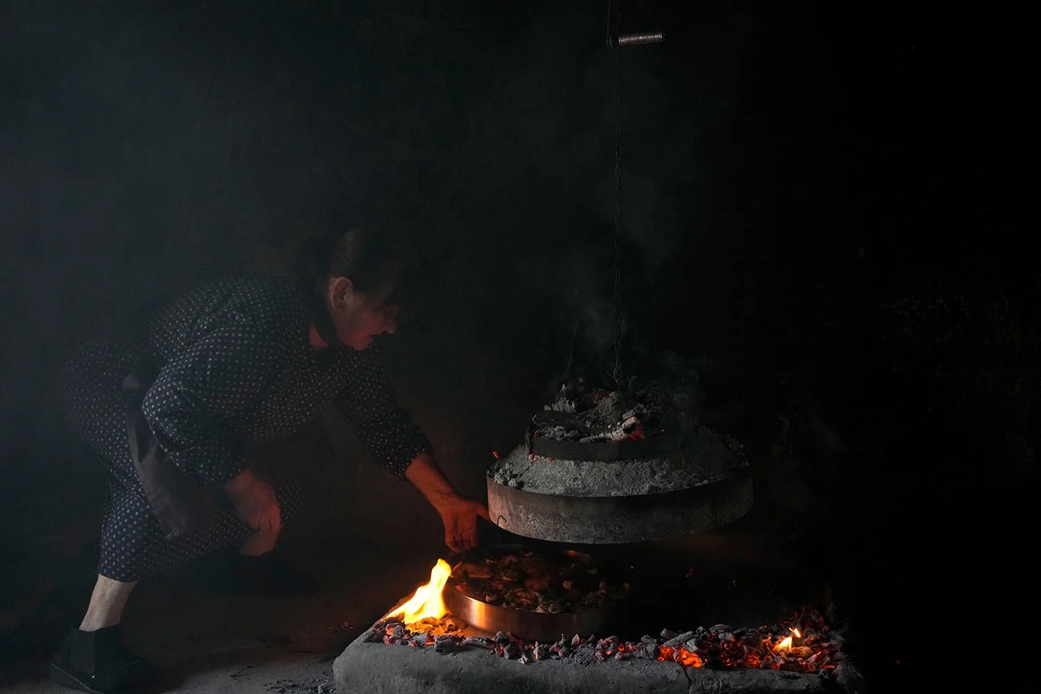 Eftichia Pliakou, 77, puts the Easter lamb under the gastra, a local traditional grill, in Myrodafni village, Epirus region, northwestern Greece, on Sunday, April 24, 2022. (AP Photo/Thanassis Stavrakis)