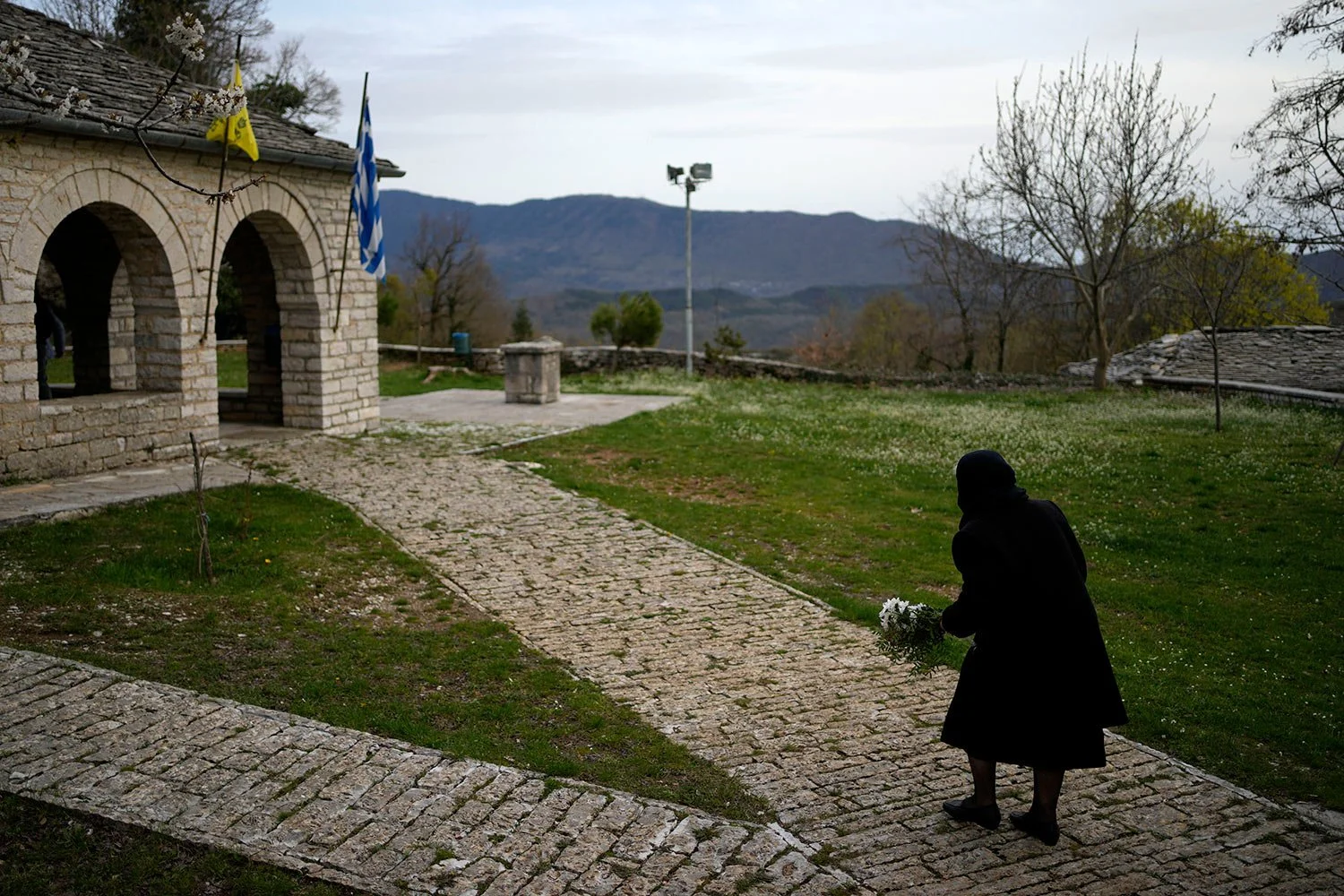 An elderly woman holds flowers as she enters the yard of Agios Georgios church in Monodendri village Zagorochoria, Epirus region, northwestern Greece, on Holy Thursday, April 21, 2022. (AP Photo/Thanassis Stavrakis)