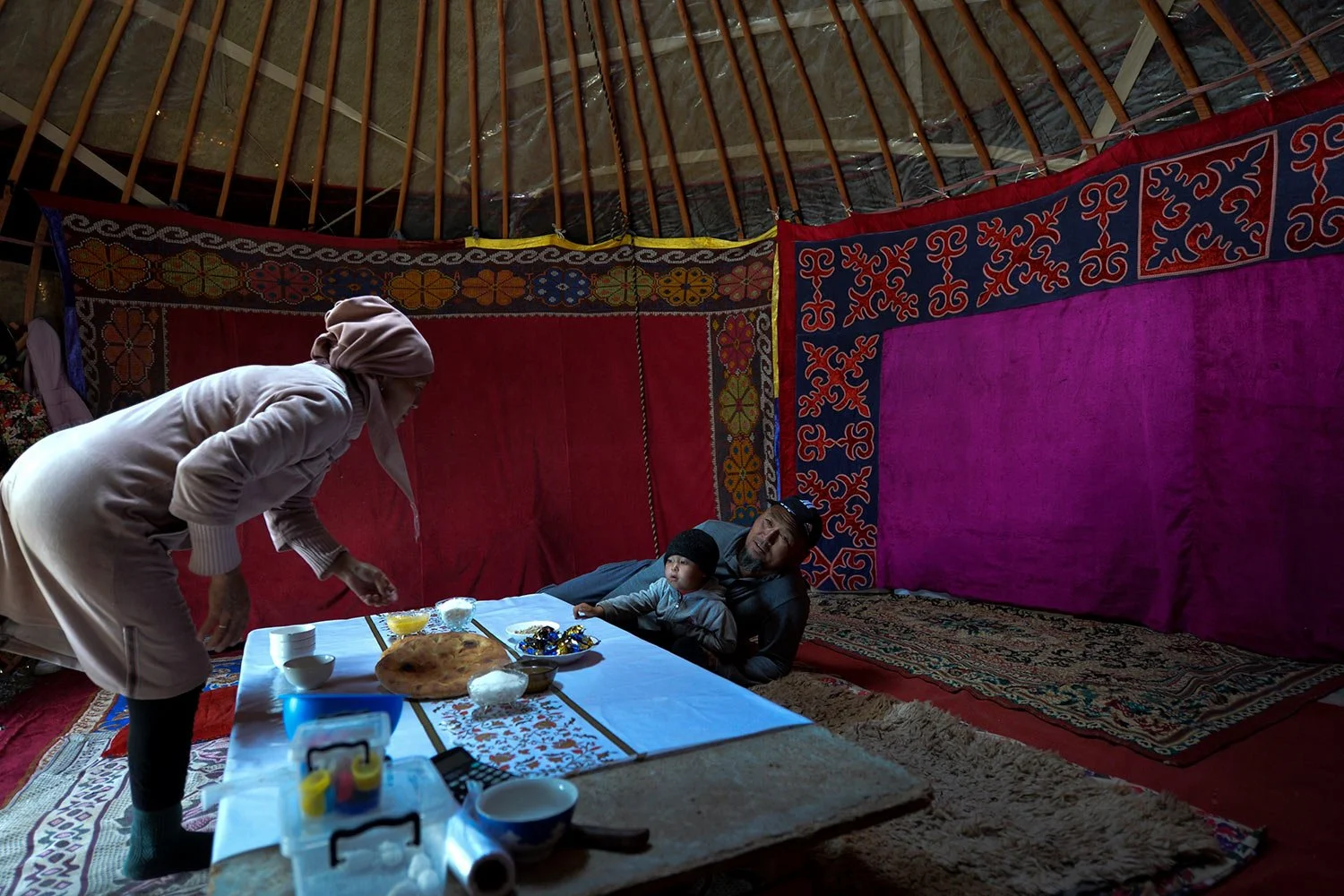 A Kyrgyz woman prepares a snack inside a traditional yurt where she lives with members of her family, shepherds herding horses in a mountain pasture in the Suusamyr Valley in Kyrgyzstan's Tian Shan mountains, 170 kilometers (100 miles) south of the capital Bishkek, Wednesday, Aug. 10, 2022. (AP Photo/Vladimir Voronin)