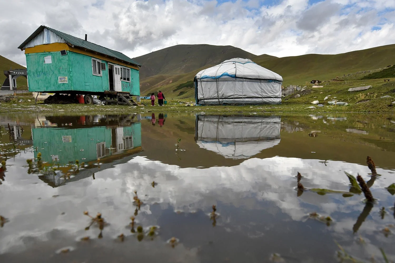 A traditional yurt, right, and a Soviet style temporary house where shepherds herding horses live are reflected in a lake in a mountain pasture in the Suusamyr Valley in Kyrgyzstan's Tian Shan mountains, 170 kilometers (100 miles) south of the capital Bishkek, Wednesday, Aug. 10, 2022. (AP Photo/Vladimir Voronin)