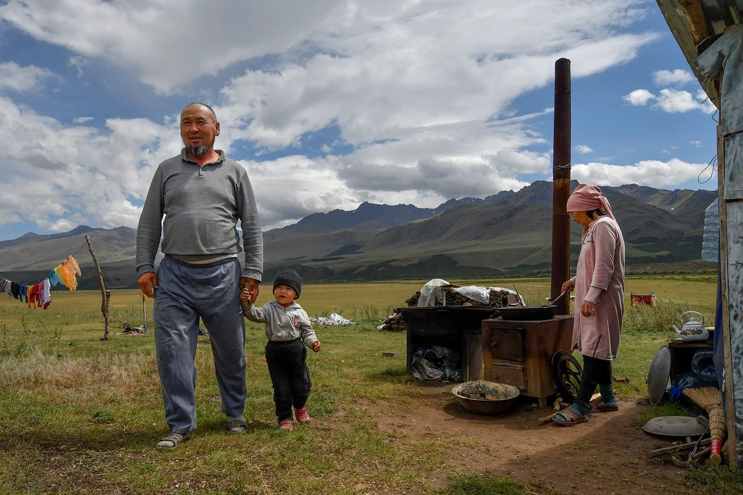 A Kyrgyz man and his child walk near a temporary tent and kitchen in a mountain pasture in the Suusamyr Valley in Kyrgyzstan's Tian Shan mountains, 170 kilometers (100 miles) south of the capital Bishkek, Wednesday, Aug. 10, 2022. (AP Photo/Vladimir Voronin)