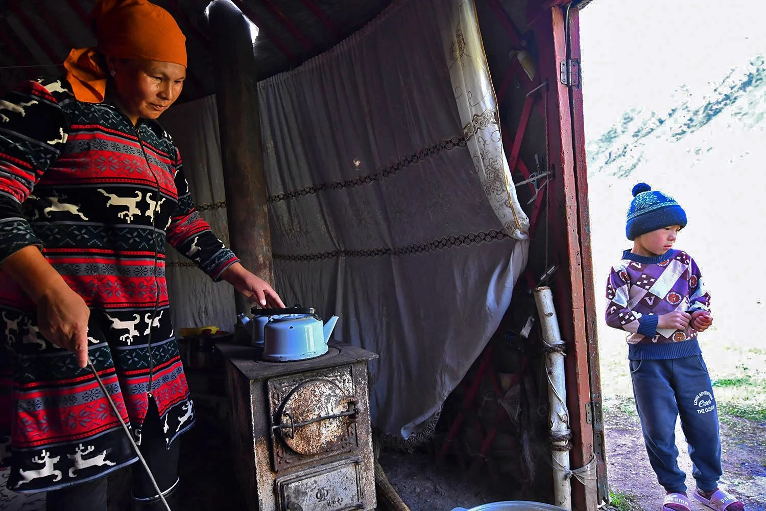 A Kyrgyz woman warms up a kettle in a traditional yurt where she lives with members of her family, shepherds herding horses in a mountain pasture in the Suusamyr Valley in Kyrgyzstan's Tian Shan mountains, 170 kilometers (100 miles) south of the capital Bishkek, Wednesday, Aug. 10, 2022. (AP Photo/Vladimir Voronin)