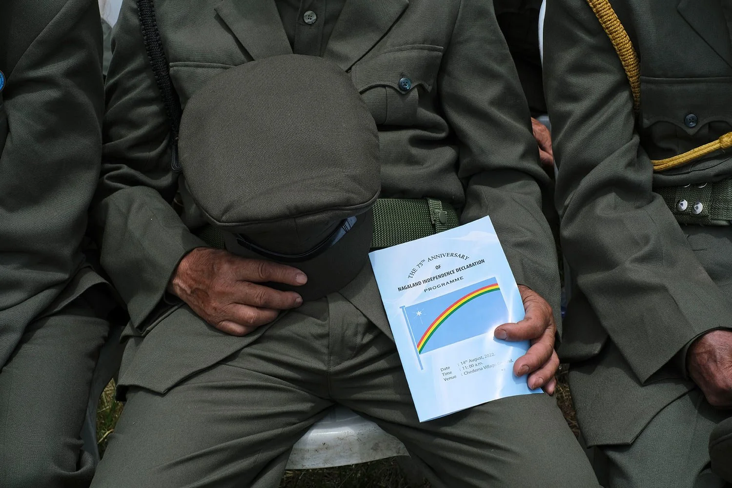 A retired veteran of the Naga Army holds his hat while joining the gathering in prayer during celebrations marking the Nagas' Declaration of Independence in Chedema, in the northeastern Indian state of Nagaland, Aug. 14, 2022. (AP Photo/Yirmiyan Arthur)