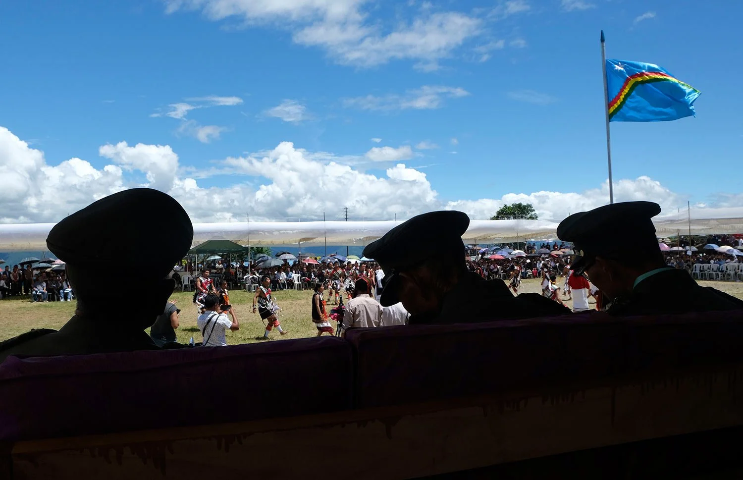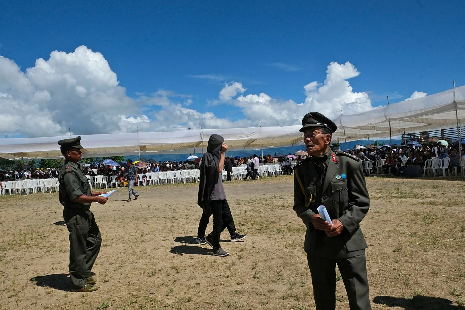Thousands gathered Sunday at the event organized by the Naga National Council, the community’s parent political organization. Infants slept on the backs of their mothers while young boys and girls helped prepare the feast that followed the hoisting of the blue Naga flag. About a hundred veteran fighters, who laid down their arms after the first cease-fire in 1964, attended the event in their uniforms.