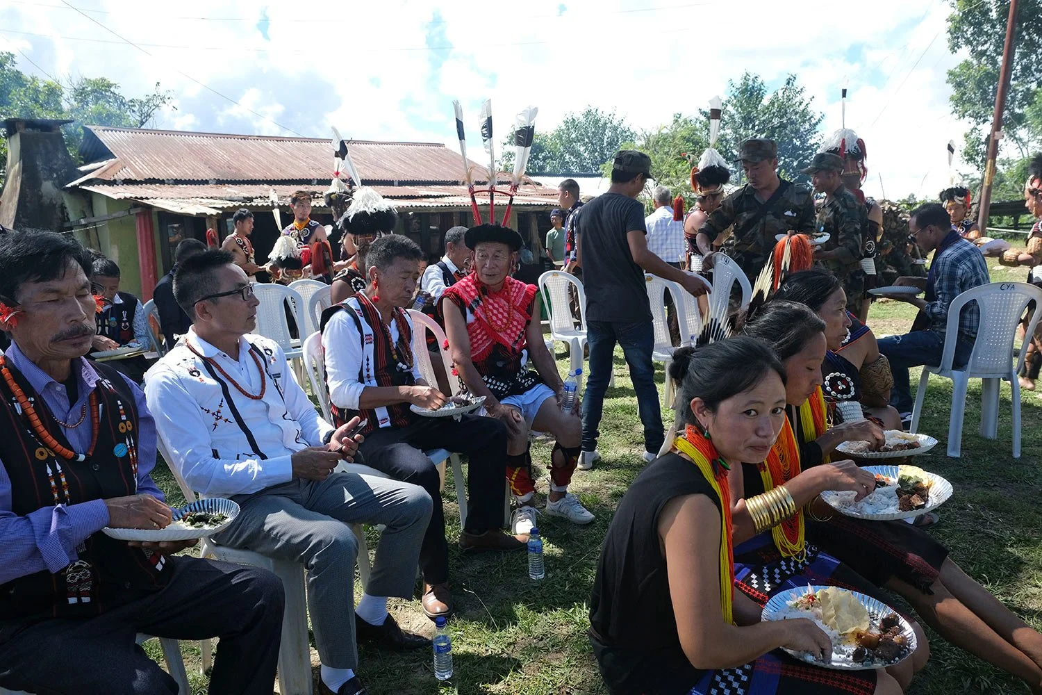 Nagas share a meal during celebrations marking their Declaration of Independence in Chedema, in the northeastern Indian state of Nagaland, Aug. 14, 2022. (AP Photo/Yirmiyan Arthur)