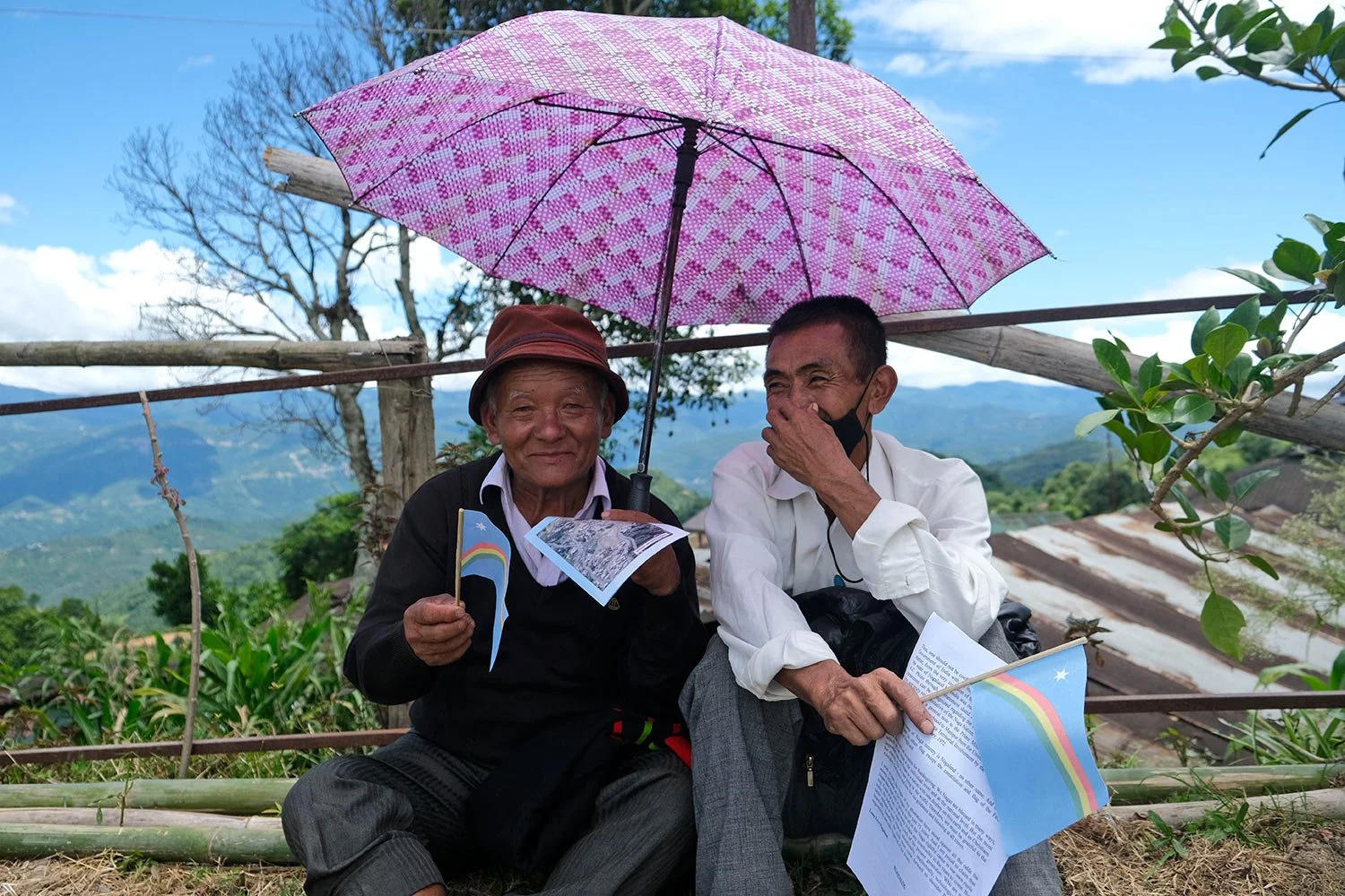 Elderly Nagas hold the Naga flag and join celebrations marking their Declaration of Independence in Chedema, in the northeastern Indian state of Nagaland, Aug. 14, 2022. (AP Photo/Yirmiyan Arthur)