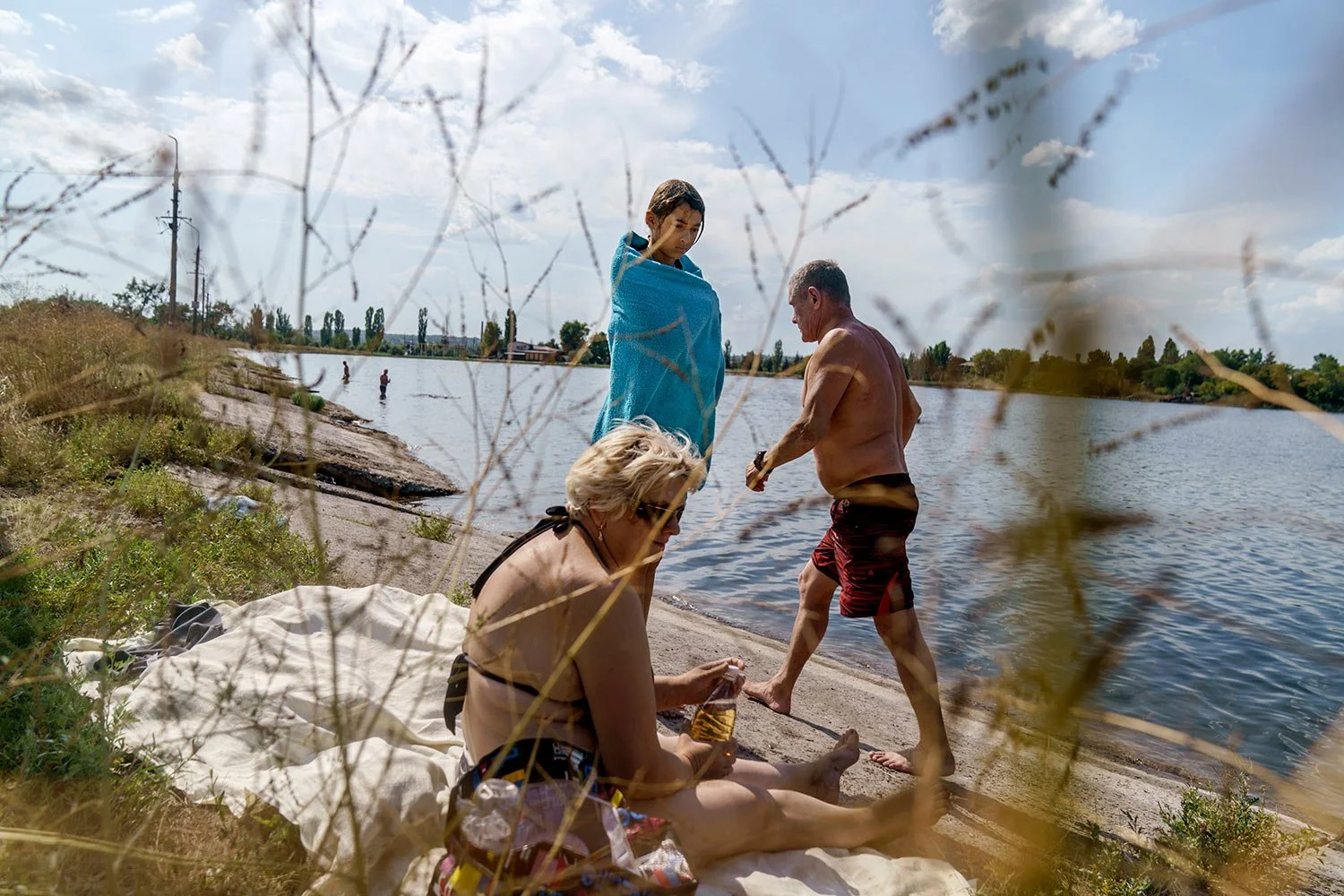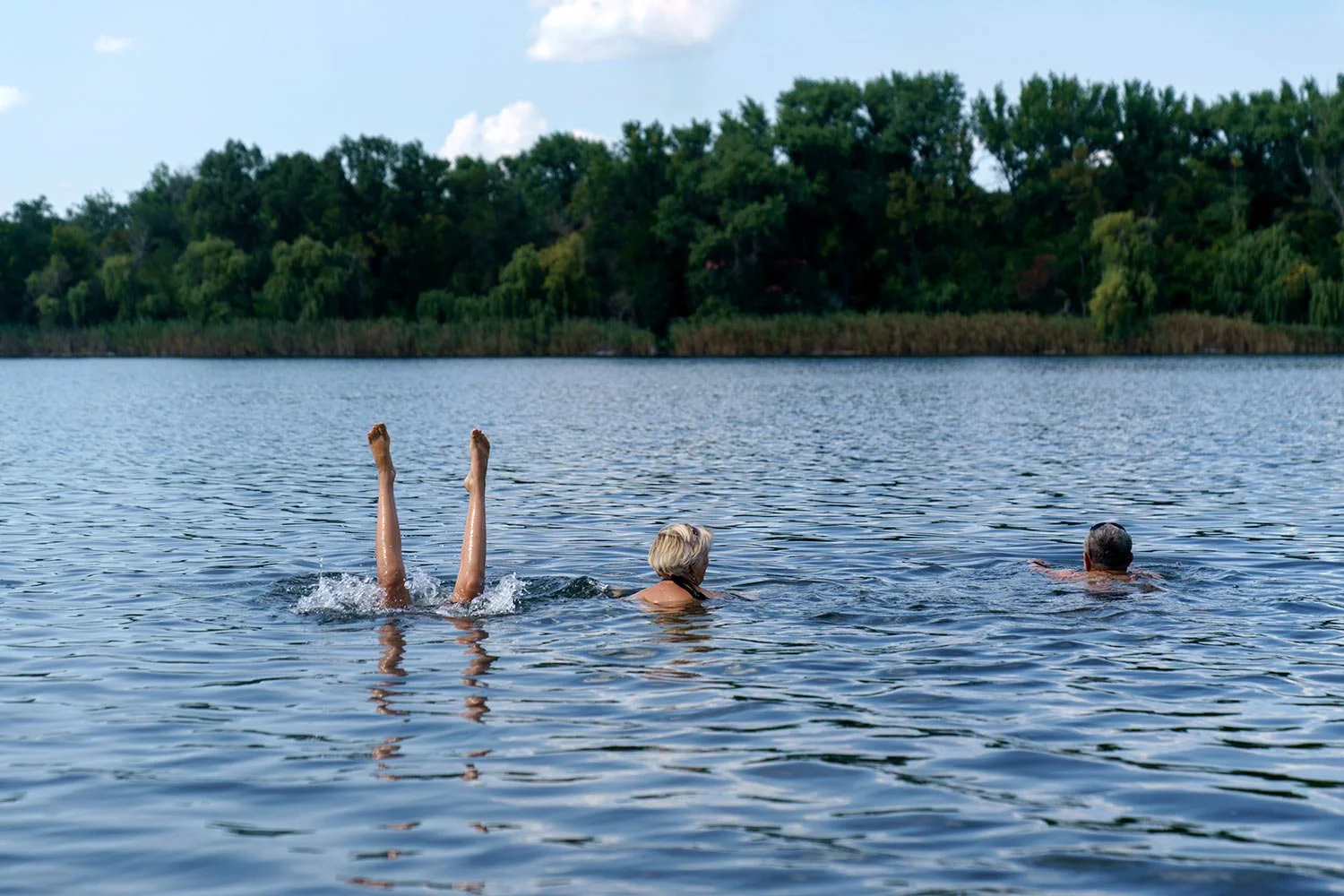 Anastasiia Aleksandrova, 12, left, plays in the water while swimming with her grandparents, Olena, and Andreii, right, at a lake in Sloviansk, Donetsk region, eastern Ukraine, Monday, Aug. 8, 2022. (AP Photo/David Goldman)