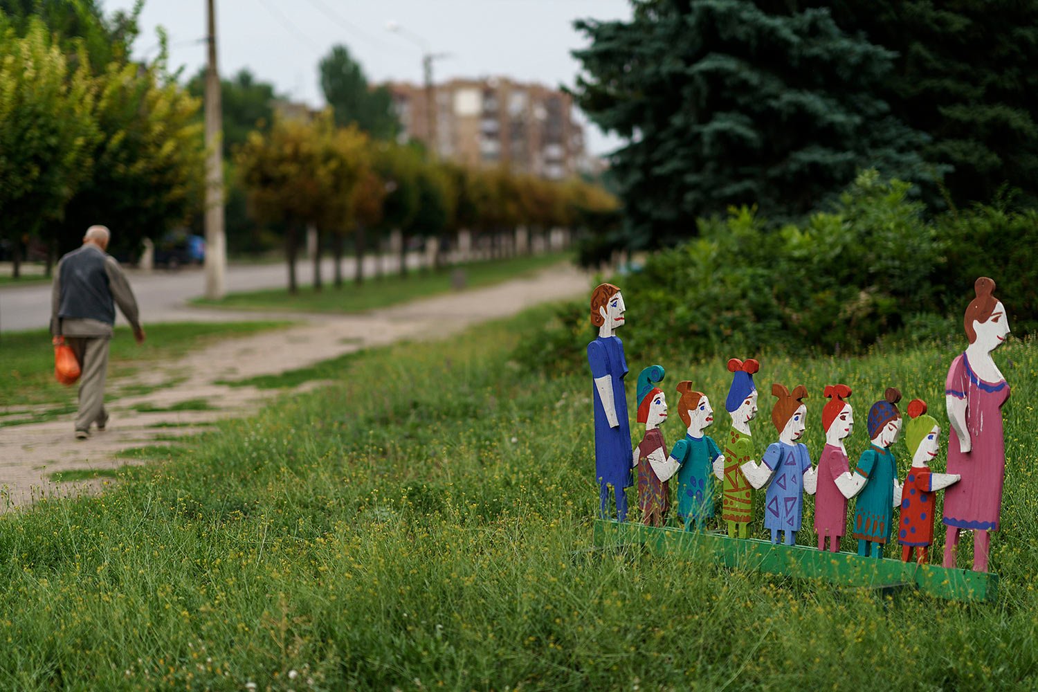 A wooden statue of children holding hands stands in an empty park in Kramatorsk, Donetsk region, eastern Ukraine, Friday, Aug. 12, 2022. (AP Photo/David Goldman)