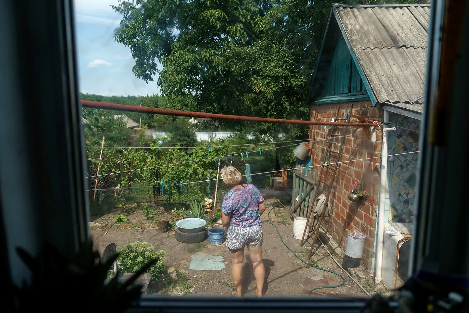 Olena Aleksandrova, looks toward the thunder of nearby artillery booms from the garden of her home in Sloviansk, Donetsk region, eastern Ukraine, Monday, Aug. 8, 2022. Olena, said the family is waiting to see what will happen in Sloviansk before making a decision on whether to leave with her 12-year-old granddaughter. The front line is only 7 miles (12 kilometers) away and their city is considered a strategic target by Russia's military. (AP Photo/David Goldman)