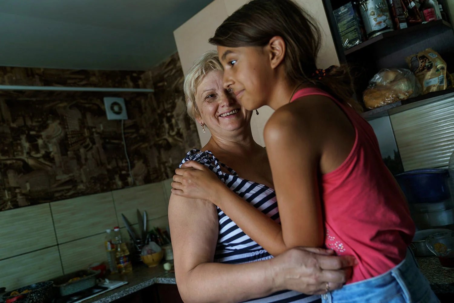 Anastasiia Aleksandrova, 12, hugs her grandmother, Olena, at their home in Sloviansk, Donetsk region, eastern Ukraine, Monday, Aug. 8, 2022. "All our plans for summer are ruined but we are trying hard to make her life as colorful as possible," said Olena. "She is always with us, because you never know when and where there might be bombings. War does not bring happiness to anybody." (AP Photo/David Goldman)
