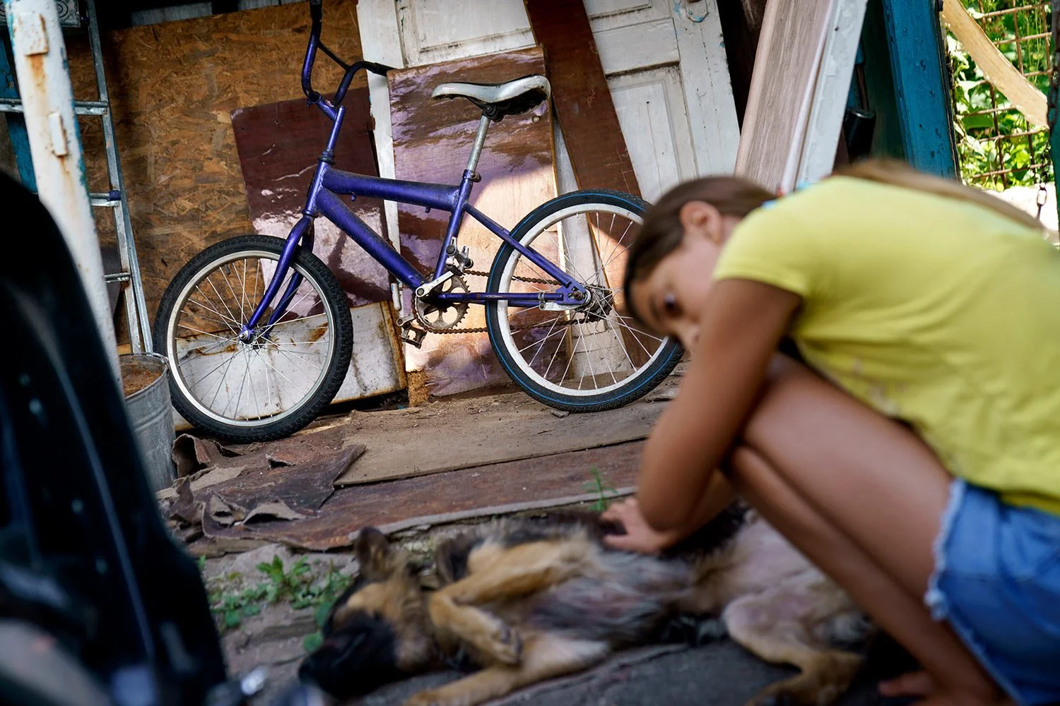 The bike belonging to Anastasiia Aleksandrova, 12, sits untouched as she pets her dog outside the home she shares with her grandparents in Sloviansk, Donetsk region, eastern Ukraine, Monday, Aug. 8, 2022. (AP Photo/David Goldman)
