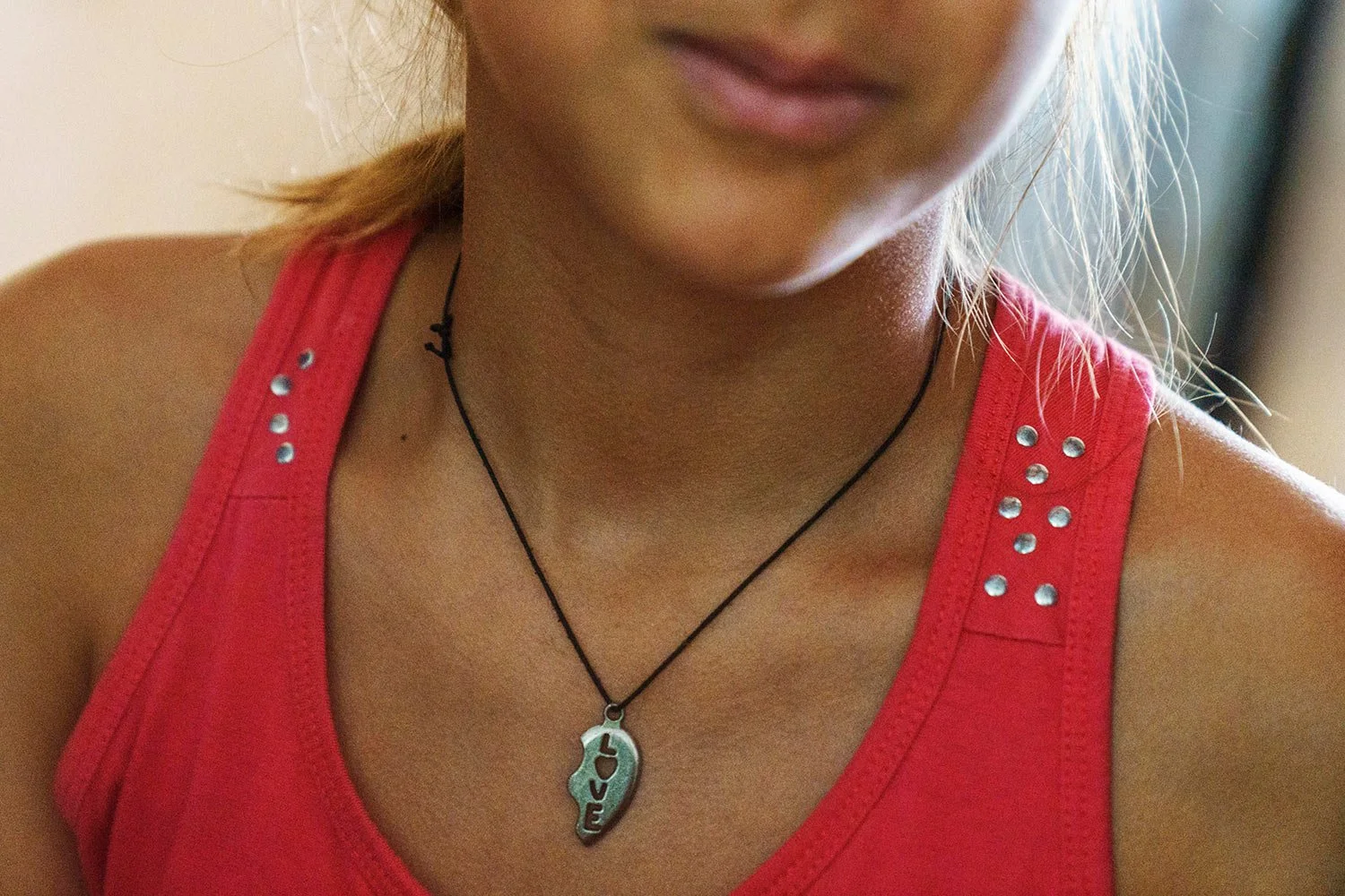 A necklace, half of a broken heart engraved with the word "Love," is worn by Anastasiia Aleksandrova, 12, at her home in Sloviansk, Donetsk region, eastern Ukraine, Monday, Aug. 8, 2022. (AP Photo/David Goldman)