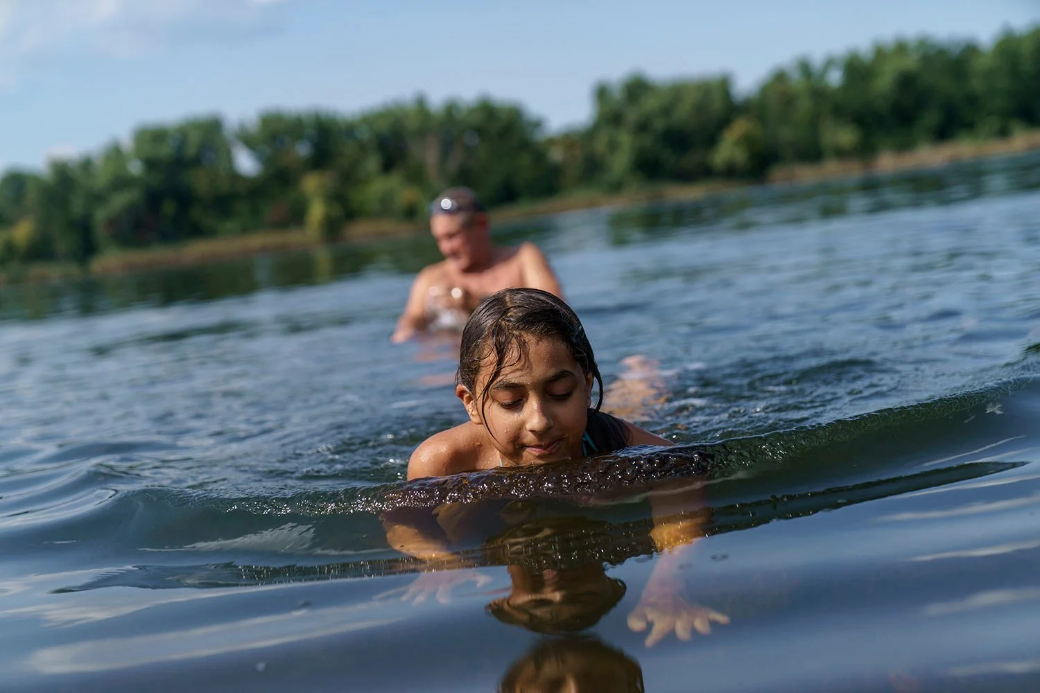 Anastasiia Aleksandrova, 12, plays in the water while swimming with her grandfather, Andreii, rear, at a lake in Sloviansk, Donetsk region, eastern Ukraine, Monday, Aug. 8, 2022. (AP Photo/David Goldman)